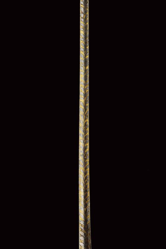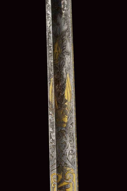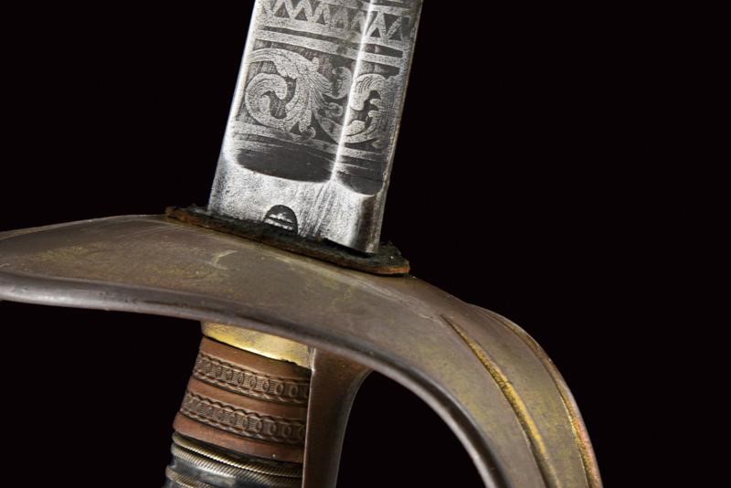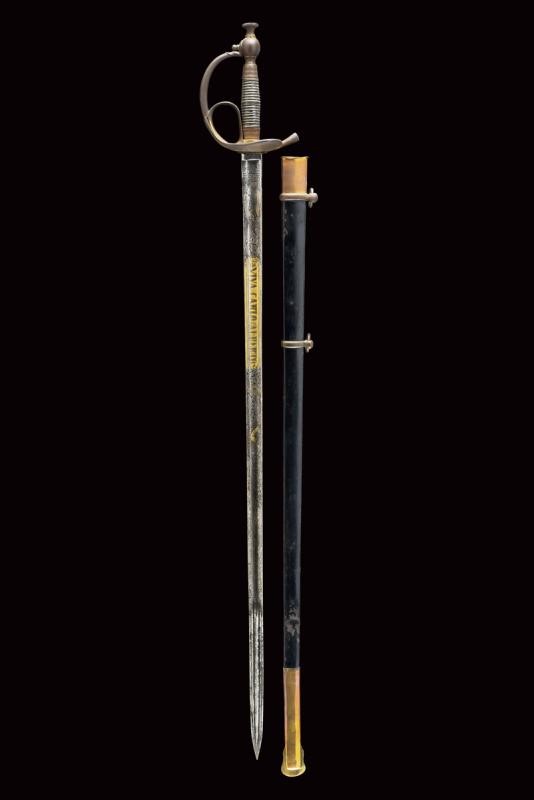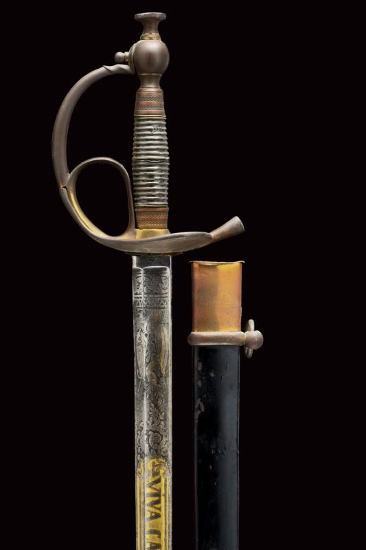 Lama dritta a un filo e controfilo con ampio sguscio che si doppia verso il debole, incisa e parzialmente dorata nella prima parte, con il motto "VIVA CARLO ALBERTO" su un lato e "VIVA LA GUARDIA CIVICA" sull'altro, trofei e decorazioni floreali. Il tallone con marca di Solingen. Tipico fornimento in bronzo con pochi resti di doratura, Impugnatura in legno rivestita con lamina d'argento. Fodero in ferro annerito con fornimenti in ottone e due anelli di sospensione.