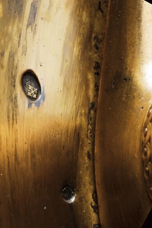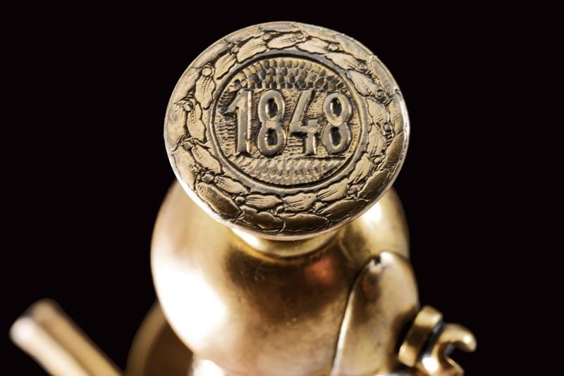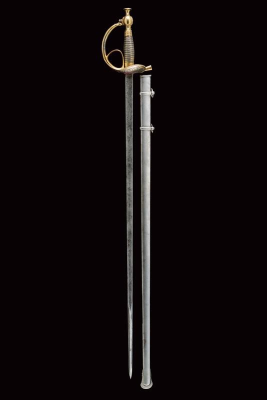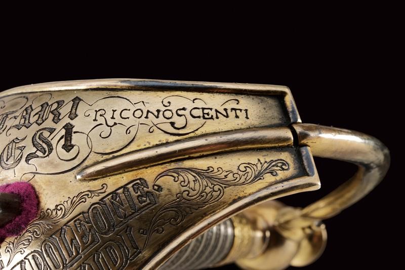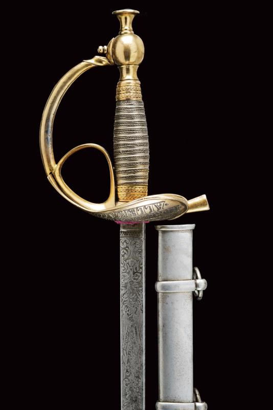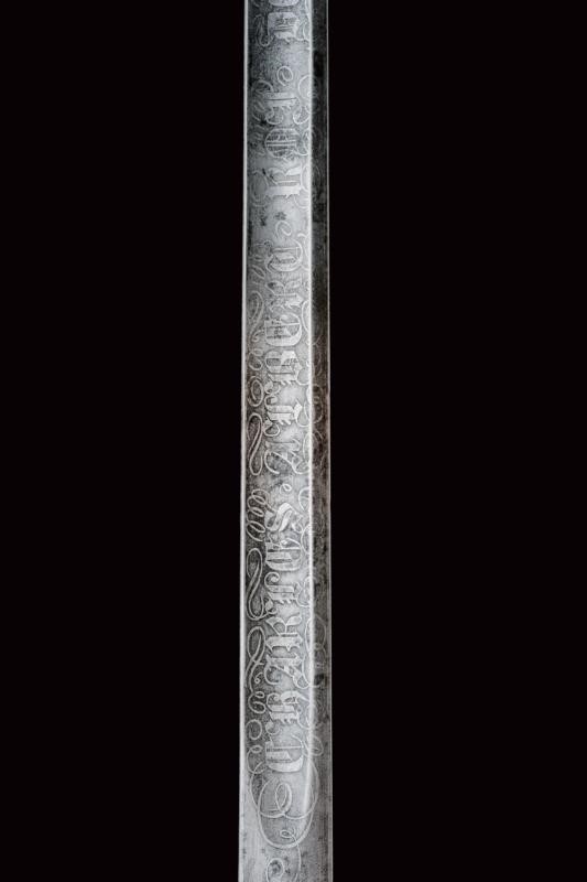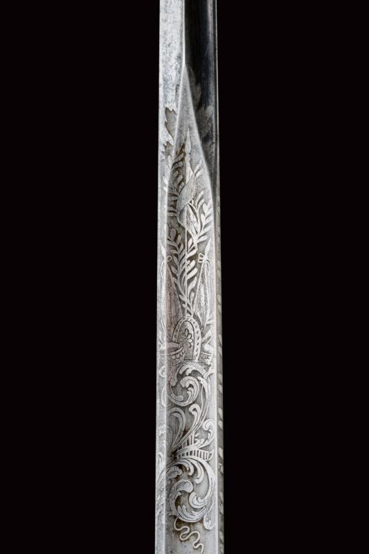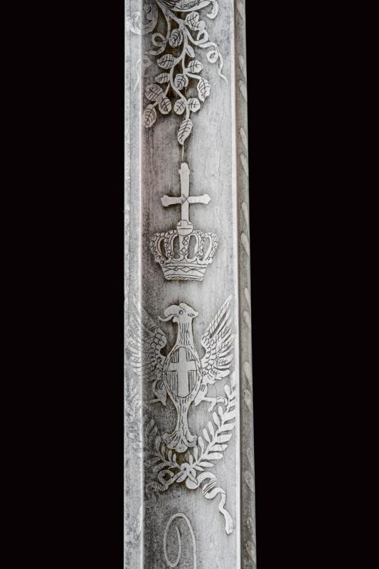 Lama dritta a un filo e controfilo, prima piatta poi scanalata ed infine, al debole, nervata, con bellissima incisione, recante l'iscrizione "A DIEU ET LE ROY" e " CHARLES ALBERT ROY DE SARDAIGNE" fra finissimi trofei e disegni floreali. Fornimento in argento dorato (punzoni sul braccio dell'elso e sul pomo) di forma tipica. La coccia finemente incisa con la dedica "I VOLONTARI GENOVESI RICONOSCENTI AL GENERALE MICHELE NAPOLEONE ALLEMANDI"; sul bottone incisa la data "1848" entro una corona di lauro. Impugnatura rivestita d'argento a imitare la trecciola e con ghiere dorate ed incise. Fodero in ferro a due anelli di sospensione.