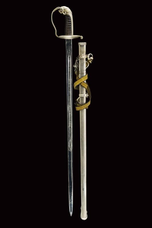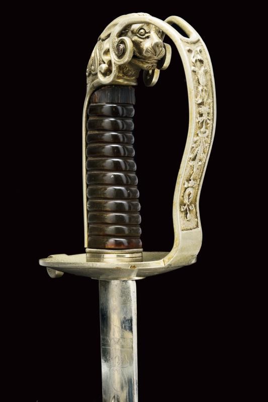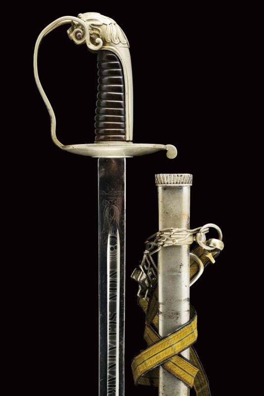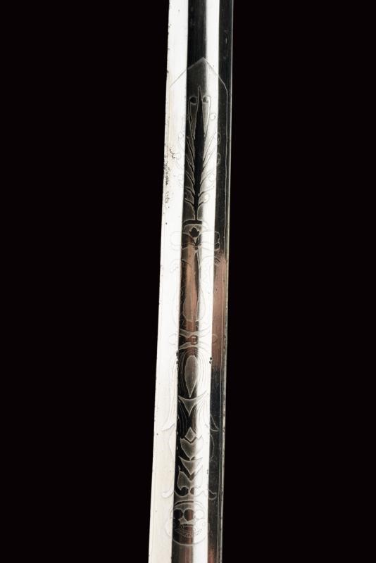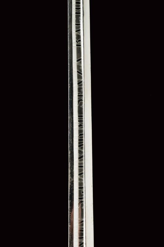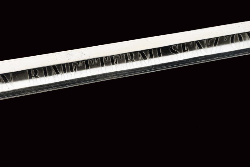 Lama dritta a un filo e controfilo con sguscio centrale recante l'iscrizione su due lati "NON SGUAINARMI SENZA RAGIONE" e "NON RIMETTERMI SENZ'ONOR" tra decorazioni floreali. Fornimento tipico in metallo bianco con pomo a testa di leone ed impugnatura in corno a spire (piccole mancanze). Fodero in ferro a due anelli di sospensione, completo di attacchi.