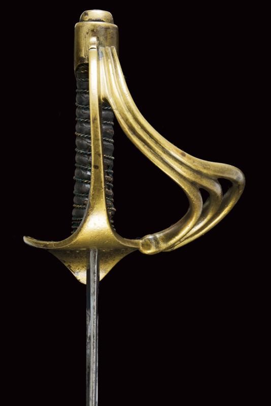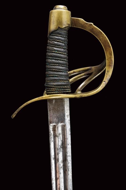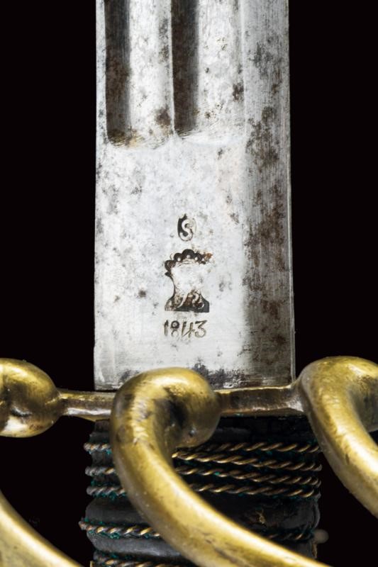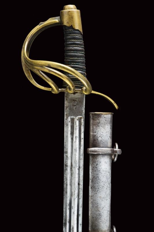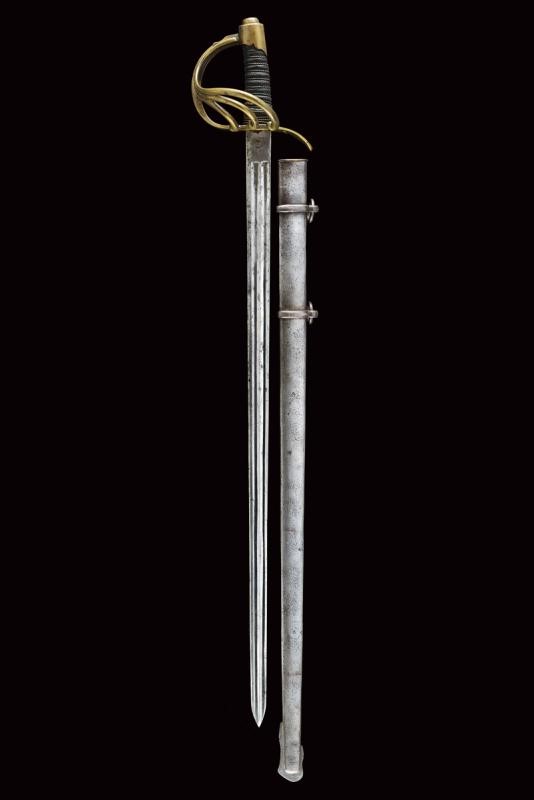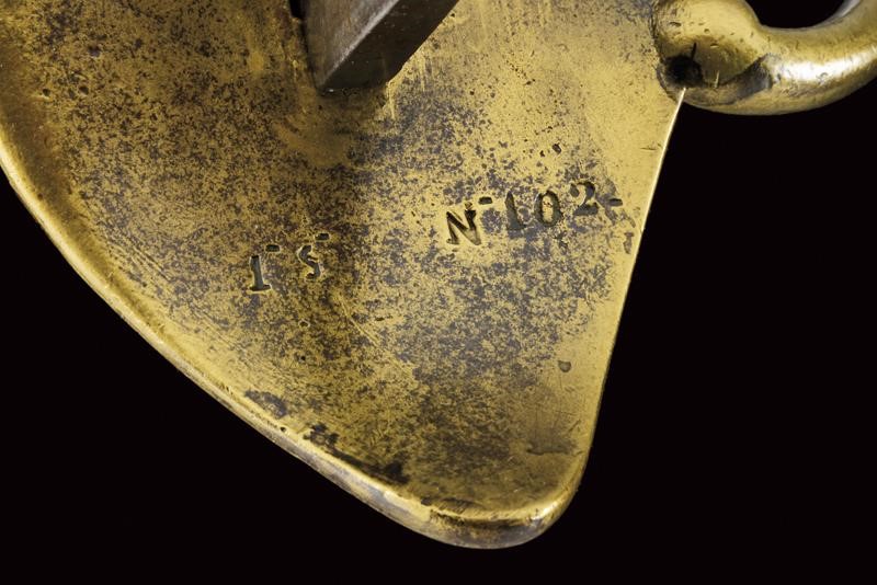 Lama dritta a un filo e breve controfilo, doppiamente sgusciata (accorciata?), recante al tallone marchio della Real Fabbrica di Napoli, punzone del controllore "S" e data "1843". Fornimento in ottone con ampia valva protettiva marcata "1 S. N. 102". Guardia con tre rami aggiuntivi, cappetta corta sagomata a volute. Impugnatura con rivestimento in cuoio (mancanza) e trecciola metallica. Fodero coevo in ferro (intaccature), marcato en suite con la spada "1 S N 102" sulla vela. Due campanelle.