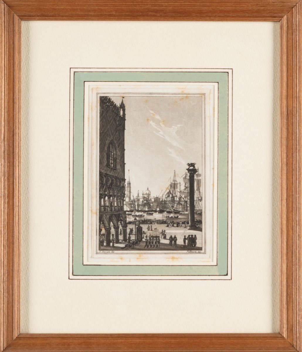 Due acquaforti raffiguranti scorci veneziani. Domenico Lovisa editore