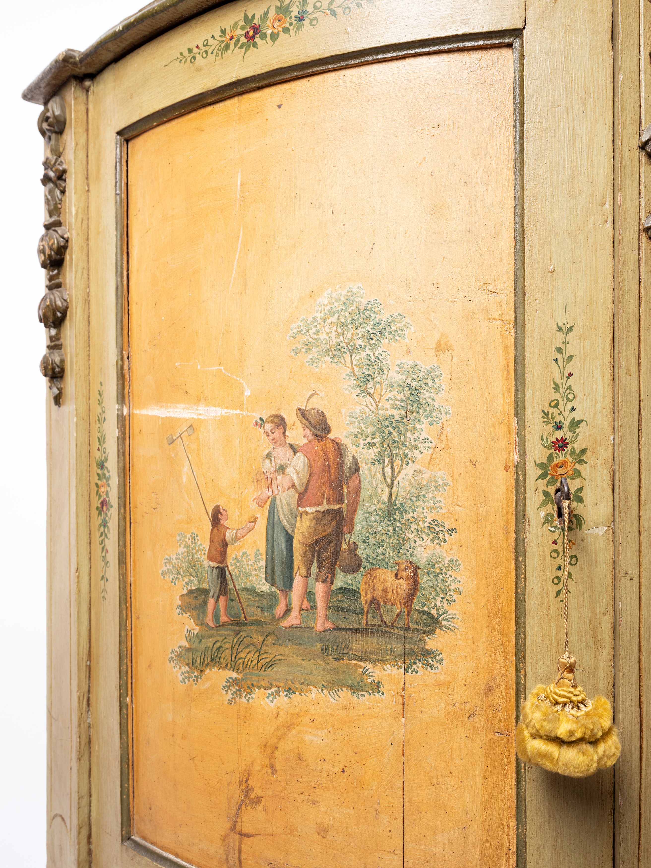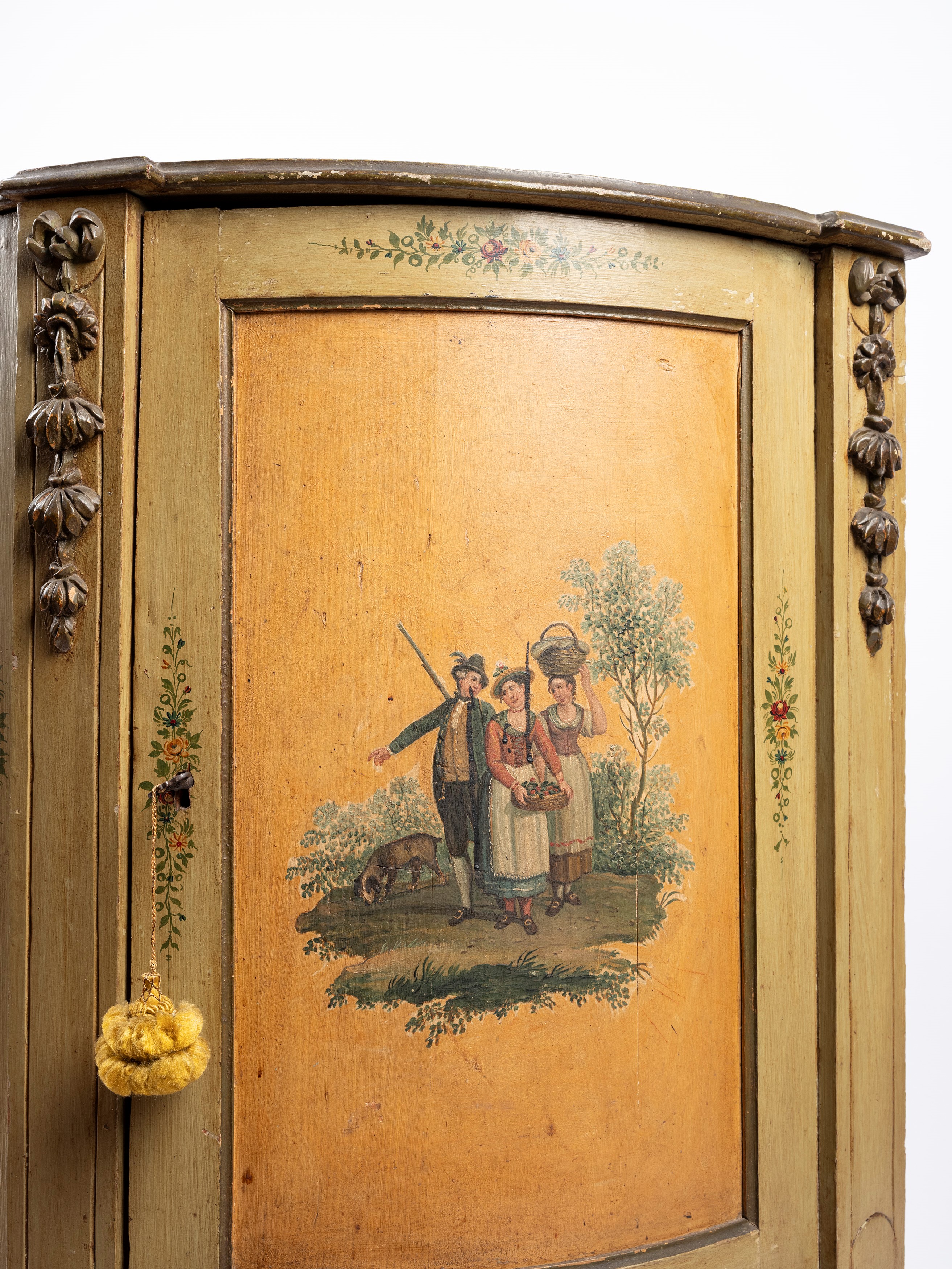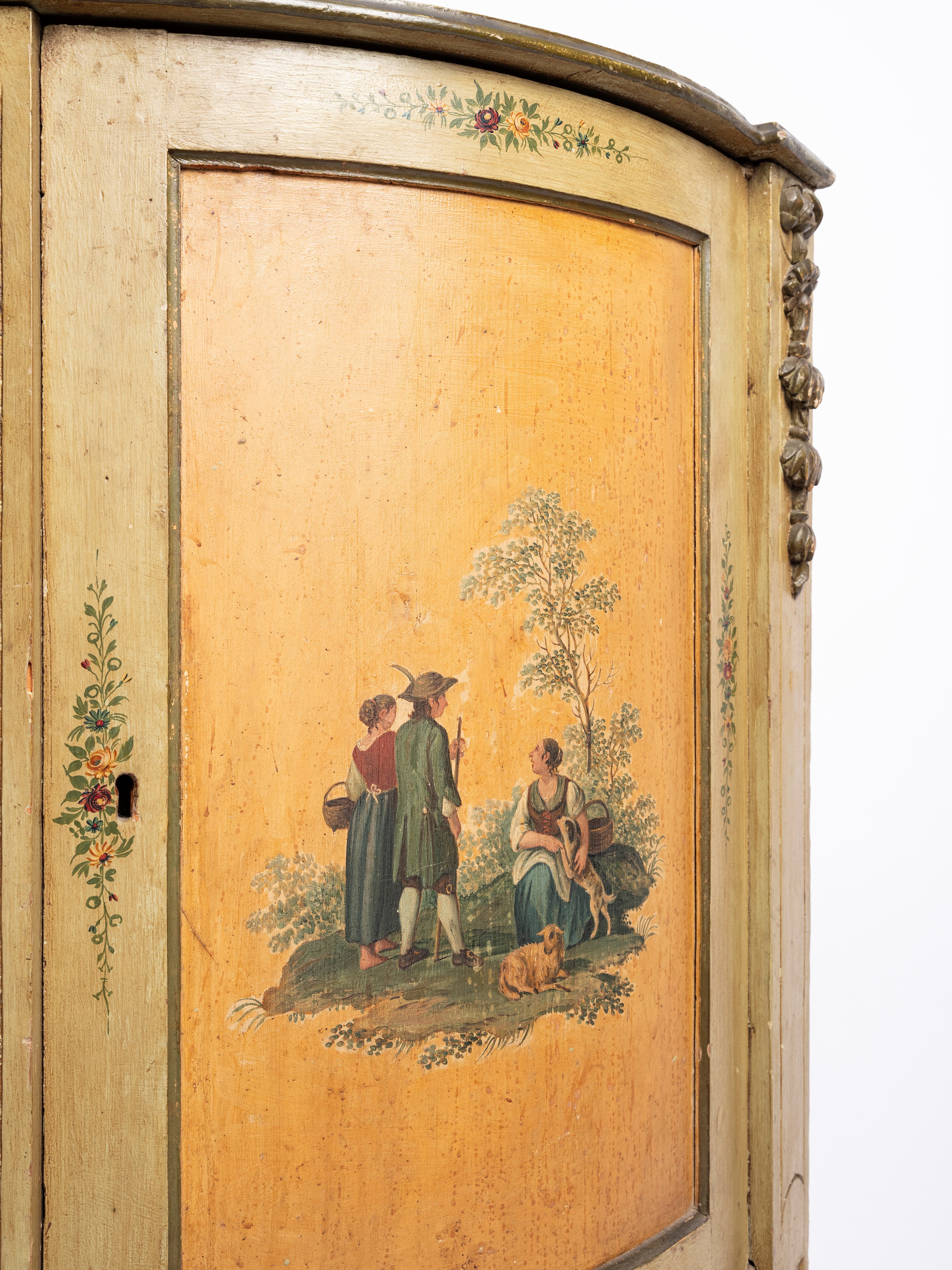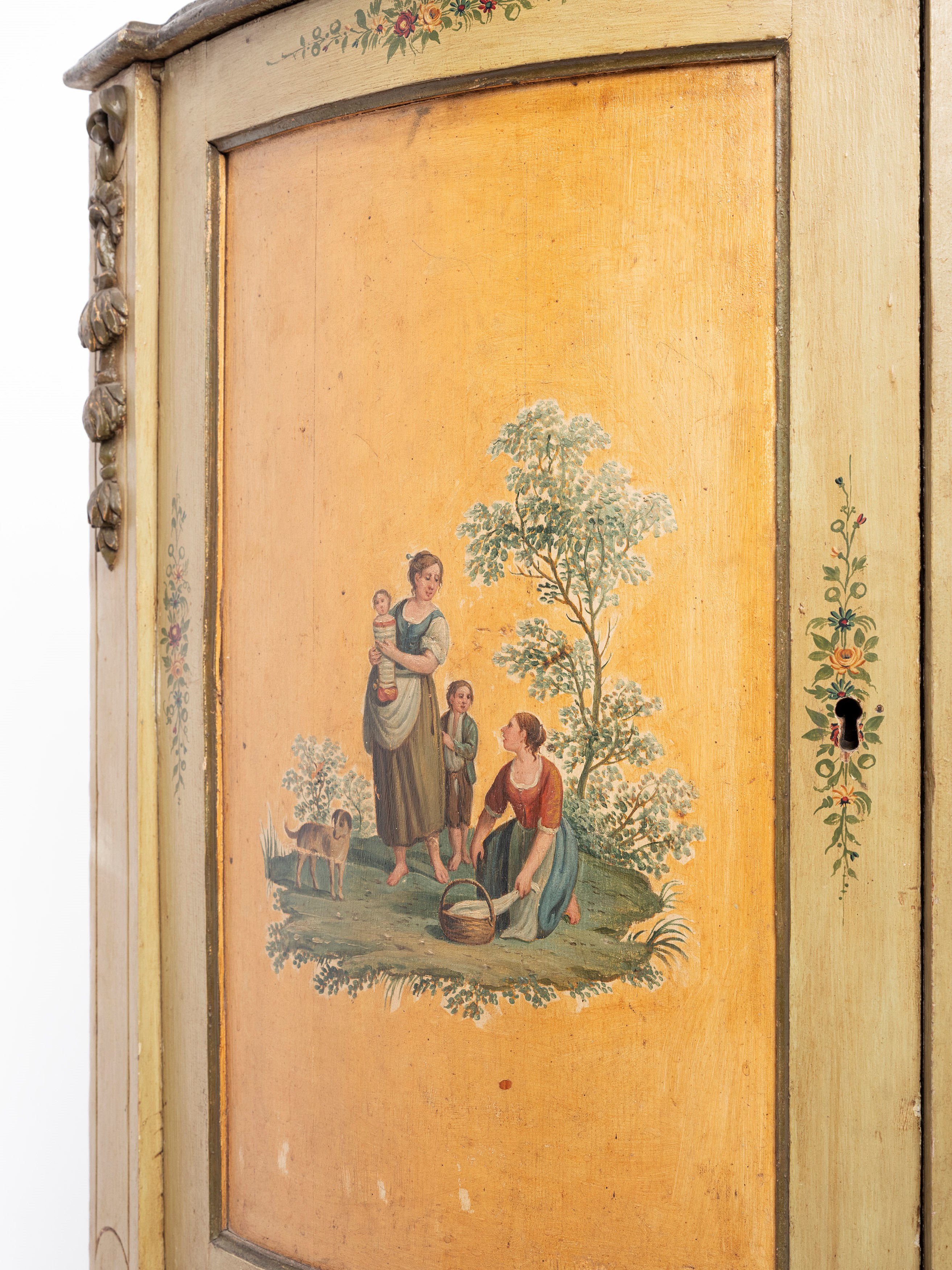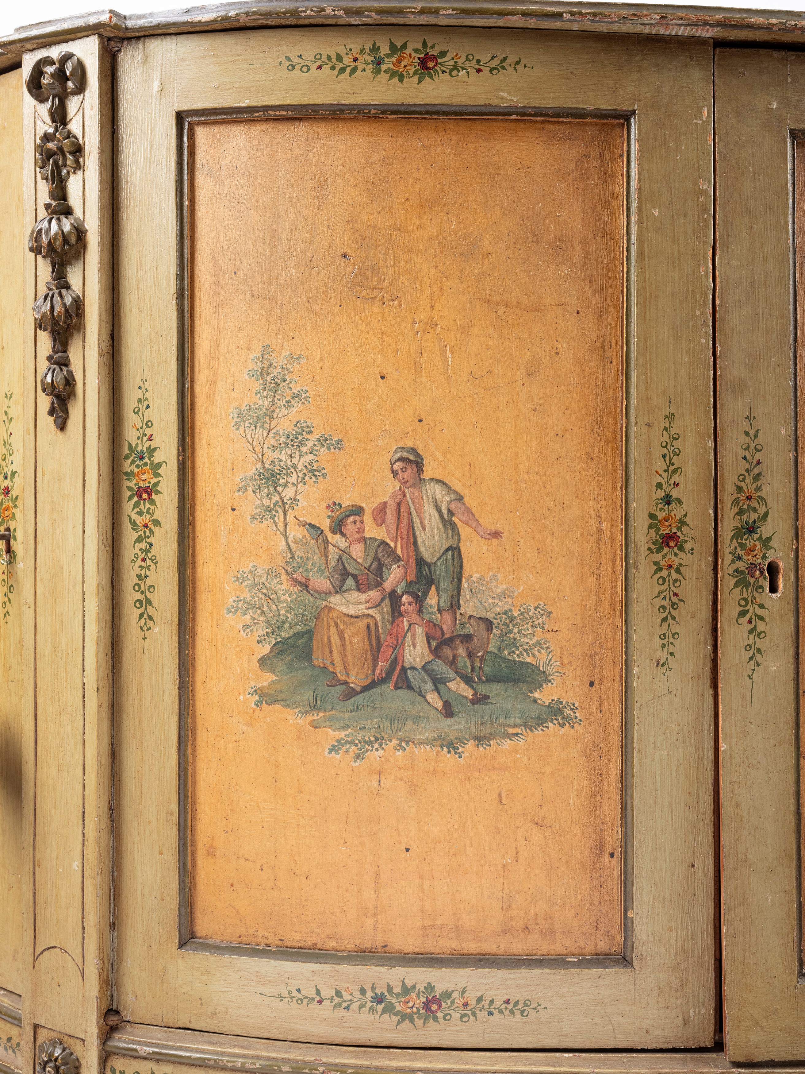 con ante pannellate e decorate da scene di genere e fiori, montanti decorati da fregi a rilievo con nastri e fiori, rosoni all'attacco, piedi torniti (piccoli difetti)