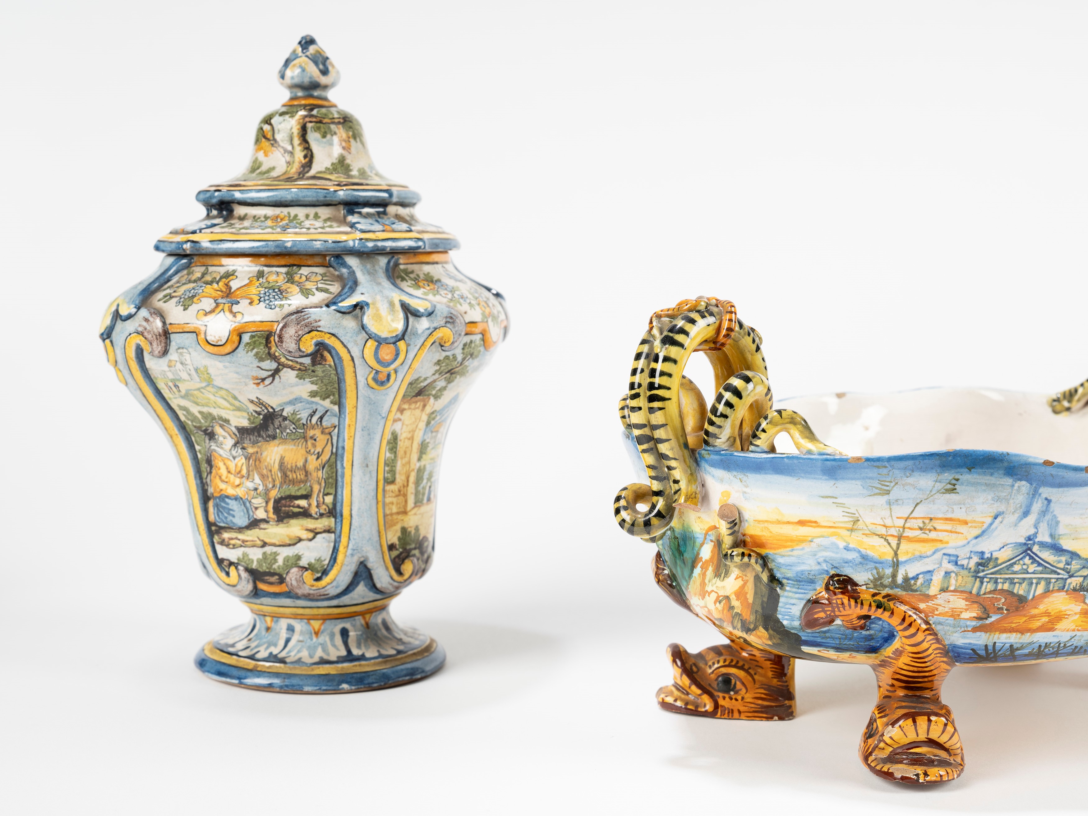 il centrotavola manifattura Cantagalli a profilo mosso, poggiante su quattro piedi a mostri marini, anse a serpenti avviluppati, corpo decorato a paesaggio con gioco di putti, marca alla base (l cm 37x27x18); la coppia di vasi di manifattura dell'Italia meridionale con corpo a balaustro decorato a riserve con scene pastorali, paesaggi, fiori e frutti (difetti)