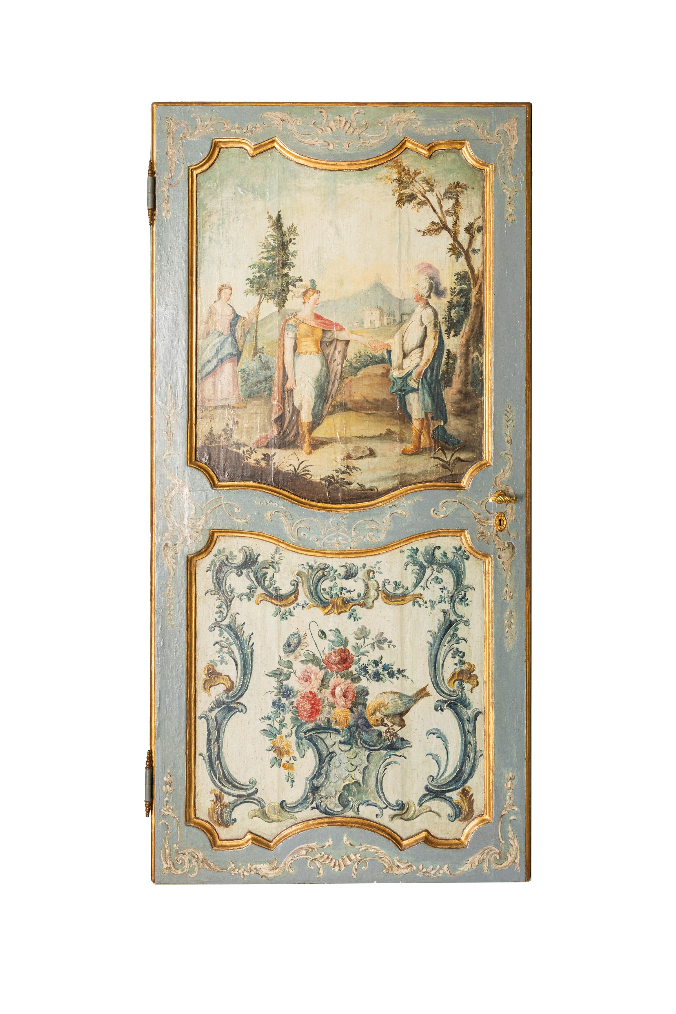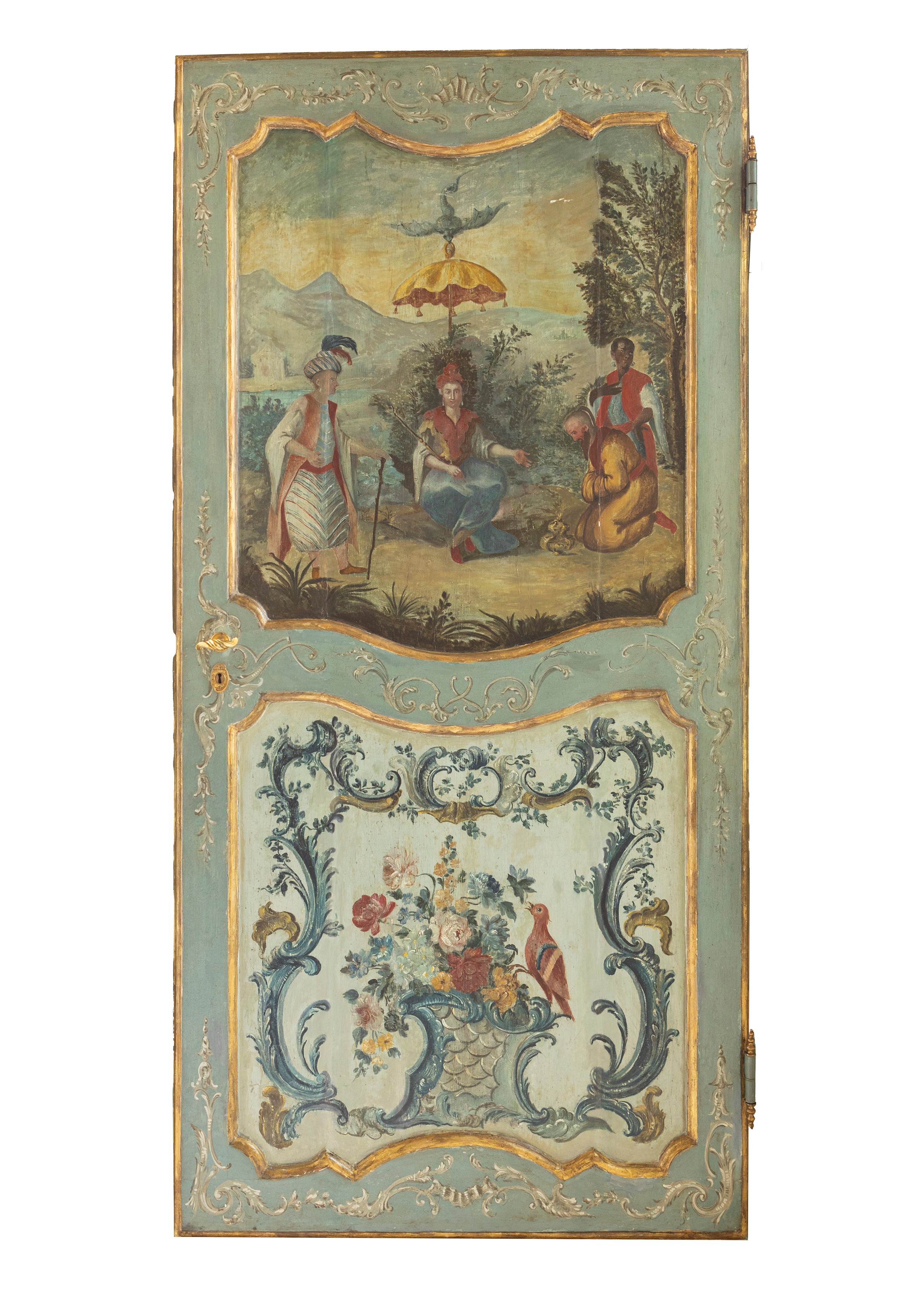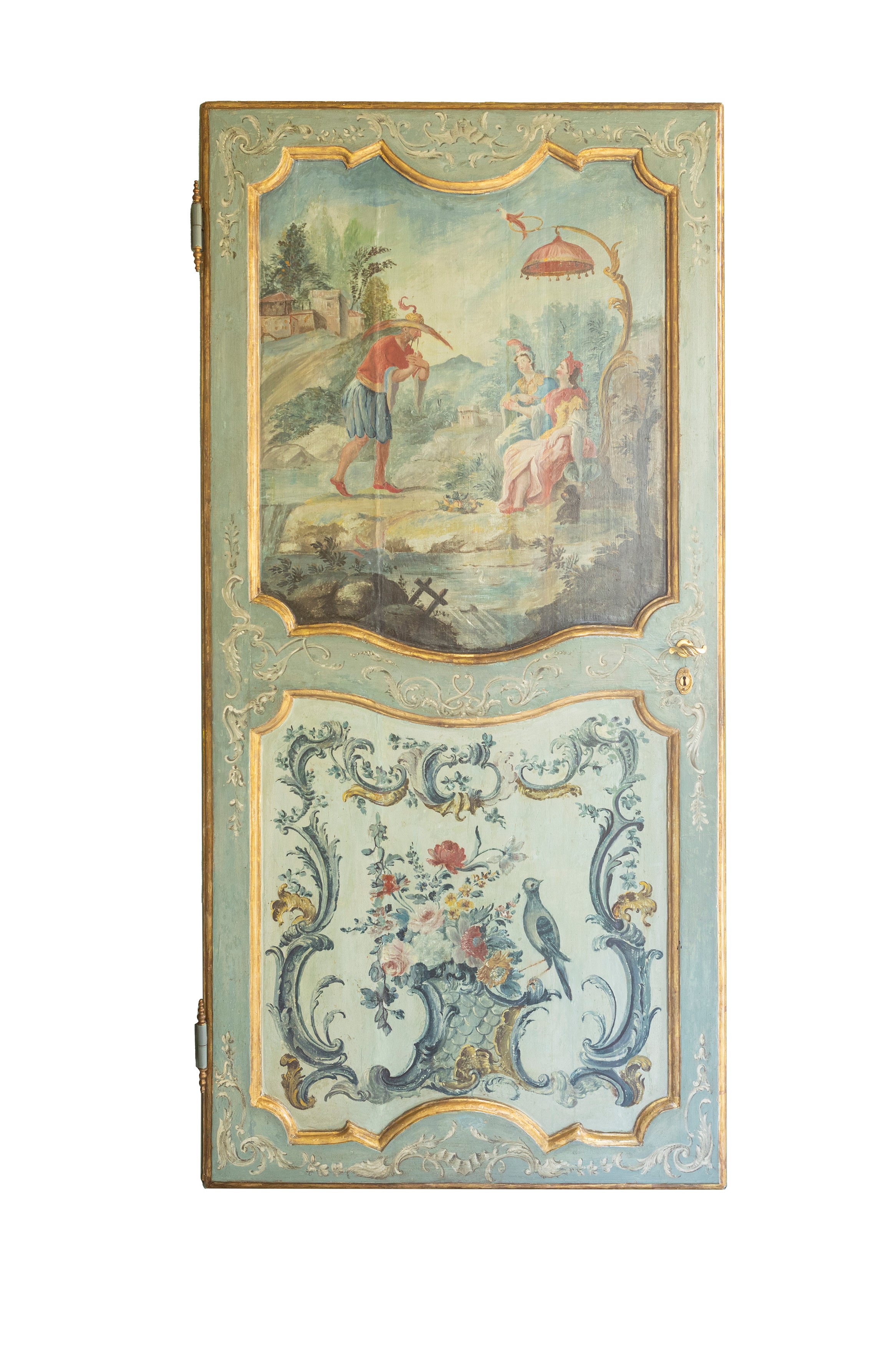 decorate con due riserve sovrapposte, quelle superiori con scene animate in paesaggio romantico, le inferiori con motivo floreale e un uccellino entro un cartiglio rocaille