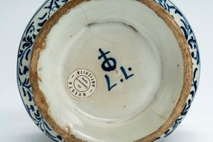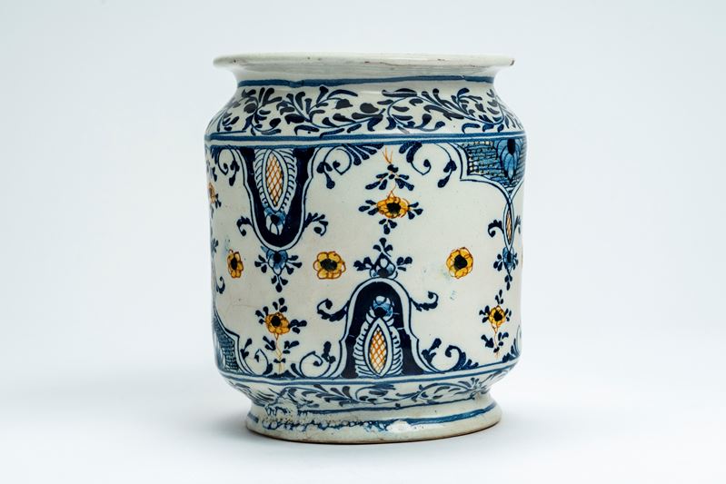 Albarello in maiolica a gran fuoco con decoro alla Berain. Fornace Luigi Levantino, Savona, seconda metà del XVIII secolo