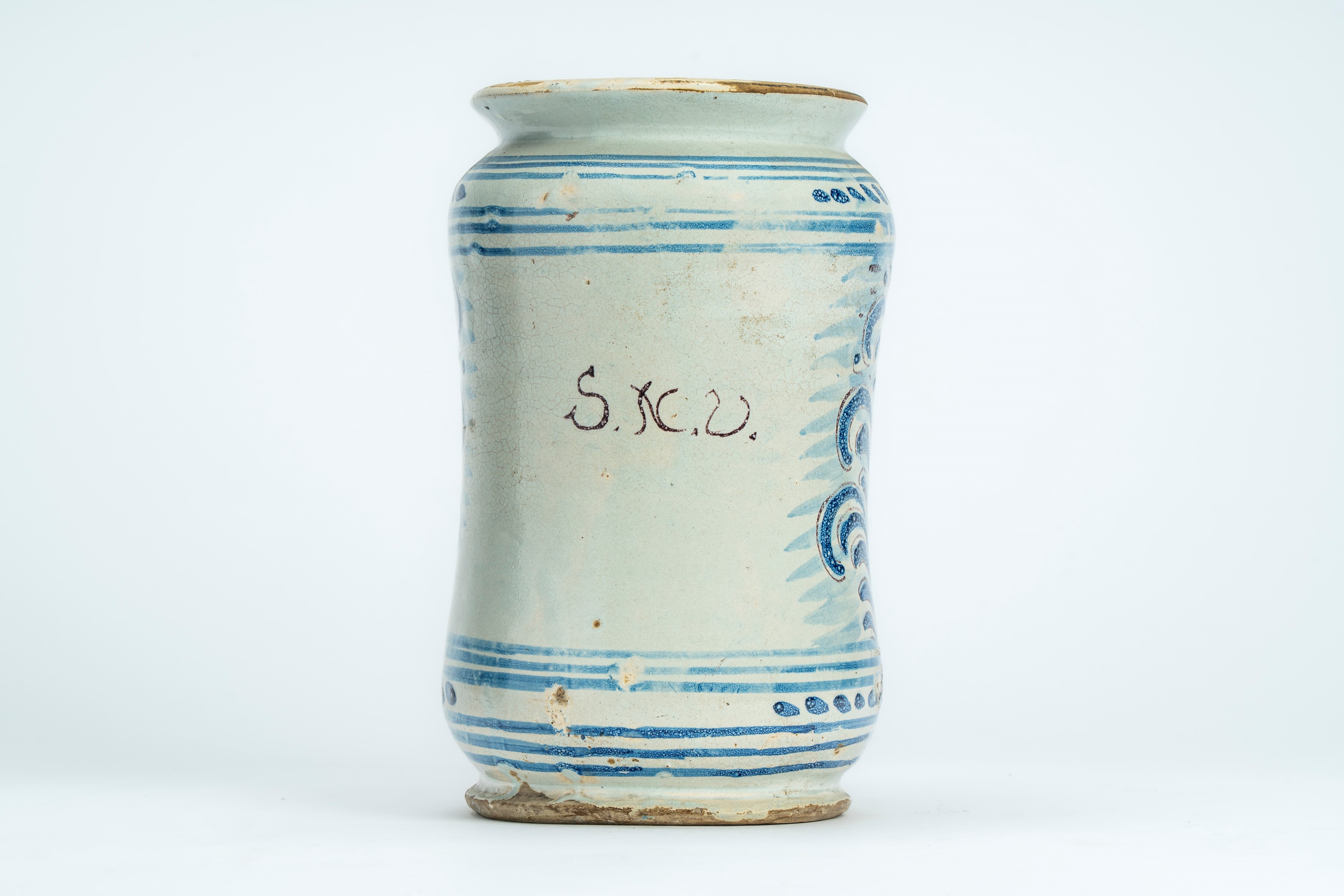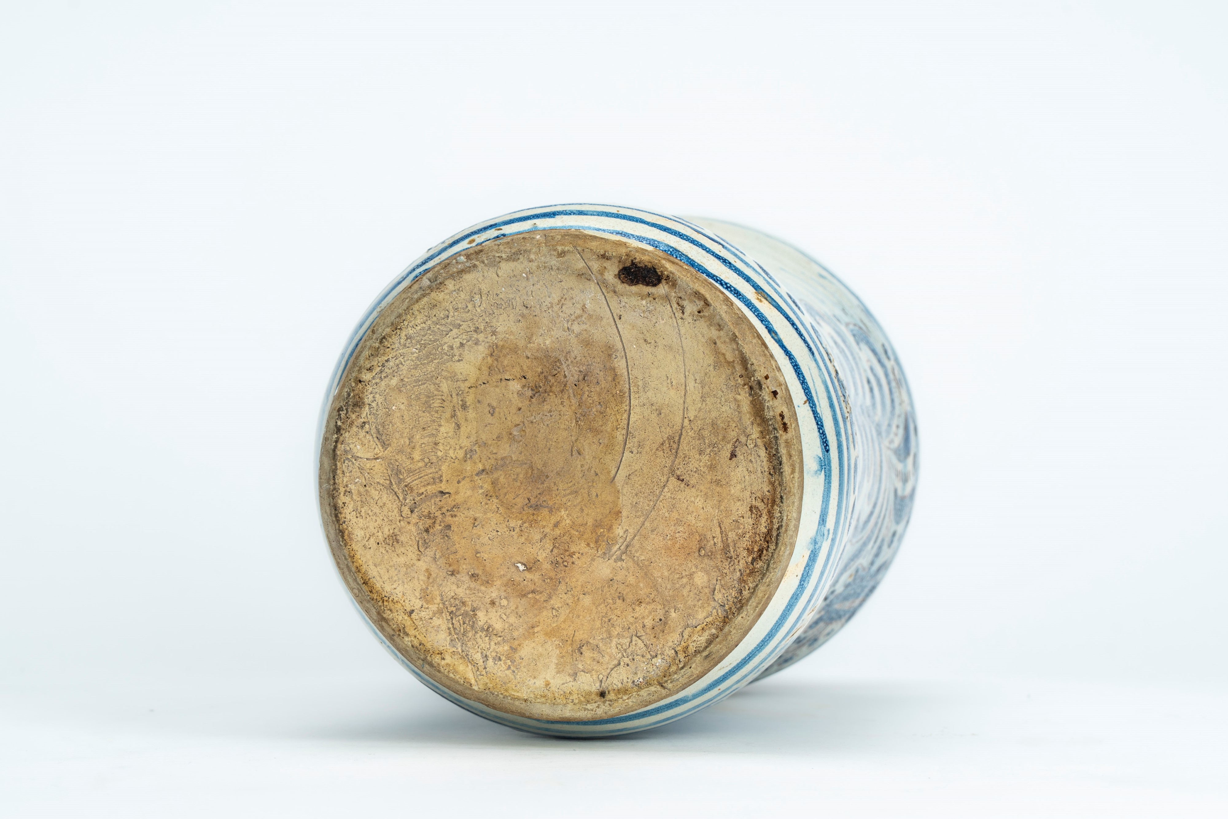 Albarello in maiolica con decoro "calligrafico naturalistico" blu cobalto a fiere in un paesaggio stilizzato. Manifattura ligure, fine secolo XVIII