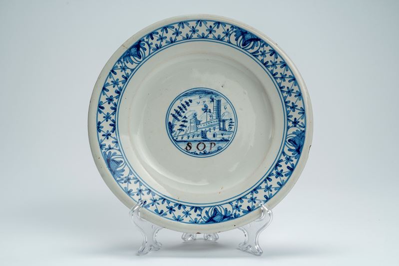 Decoro nei toni del blu cobalto. Sulla tesa, motivo stilizzato a graticcio con elementi vegetali, al centro del cavetto, entro doppio filetto circolare, paesaggio con casolari e un albero, eseguito a rapidi tocchi, con monogramma "SOP". Sbeccature.