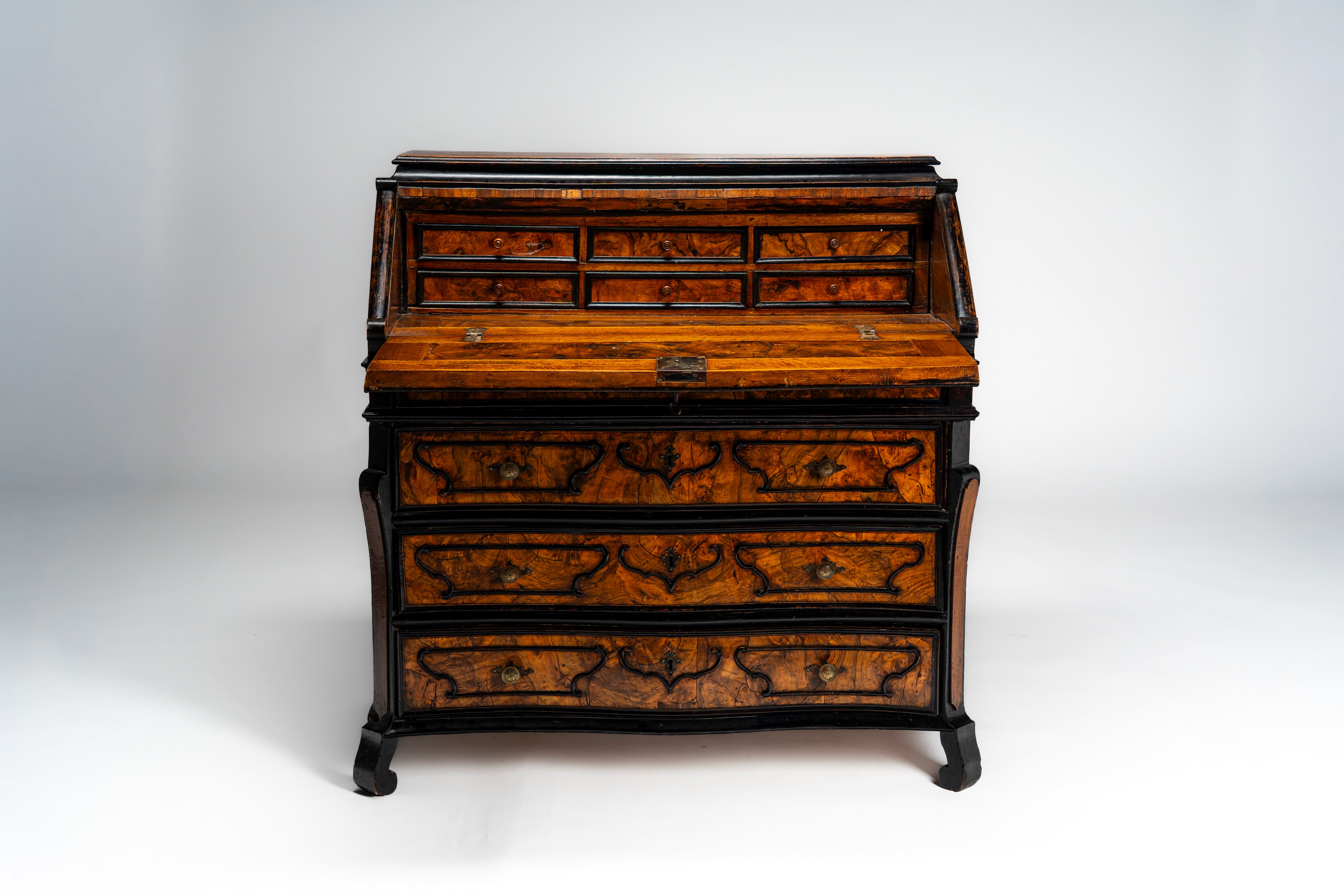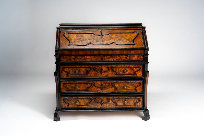 Antico cassettone lombardo a ribalta lastronato in noce e radica di noce a tre cassetti più uno a mezza altezza e calatoia celante sei tiretti. Decorato a cartelle sagomate con profili in legno ebanizzato, piedi a voluta