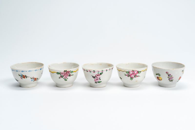 Cinque chicchere in porcellana decorata in policromia a motivi floreali: quattro di manifattura Antonibon, circa 1770, e una probabilmente di manifattura Ginori a Doccia, fine XVIII secolo