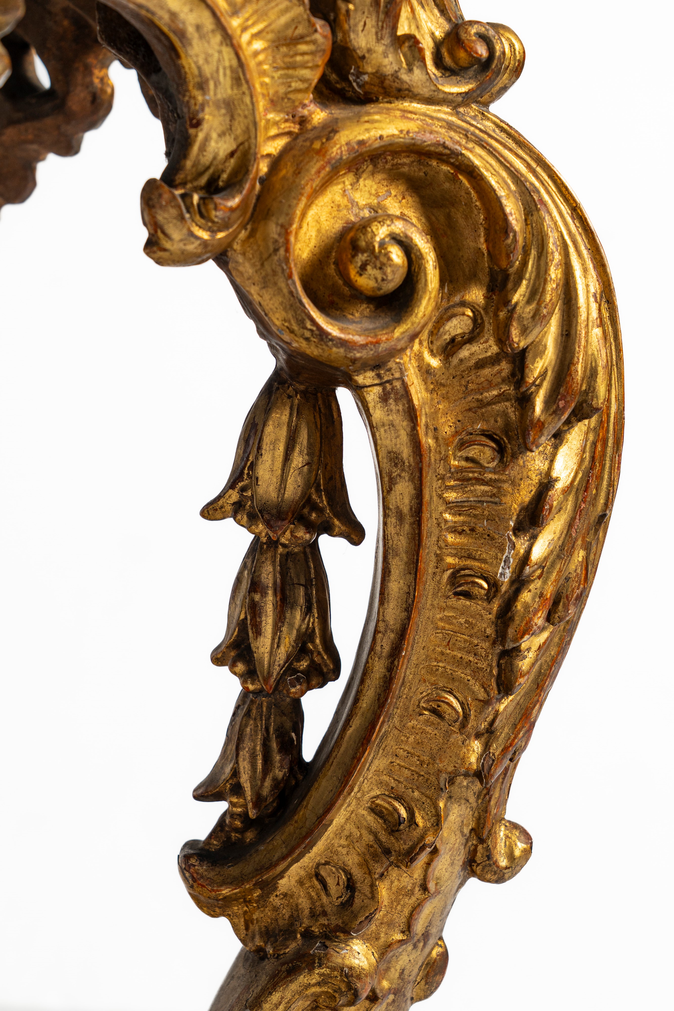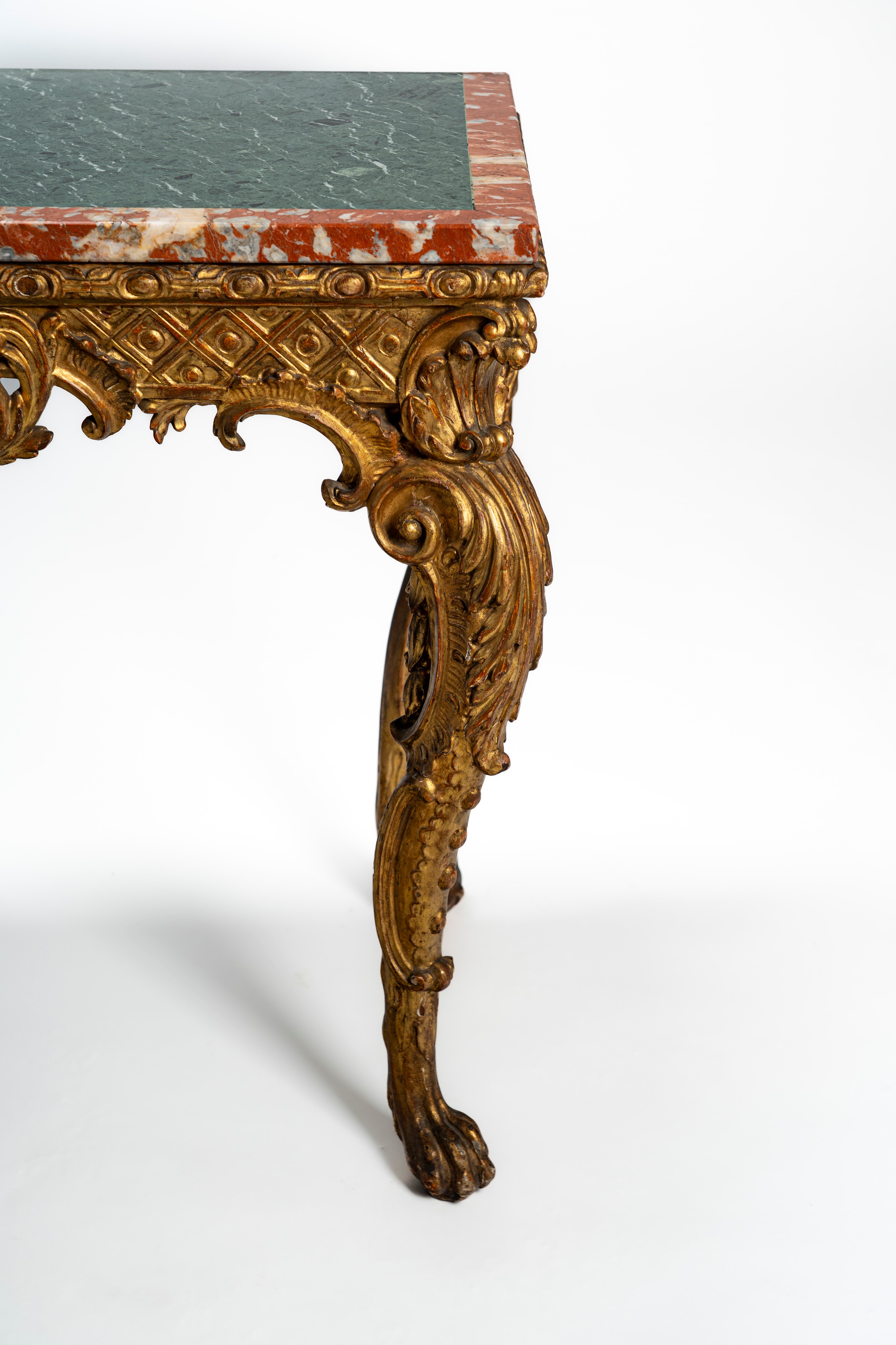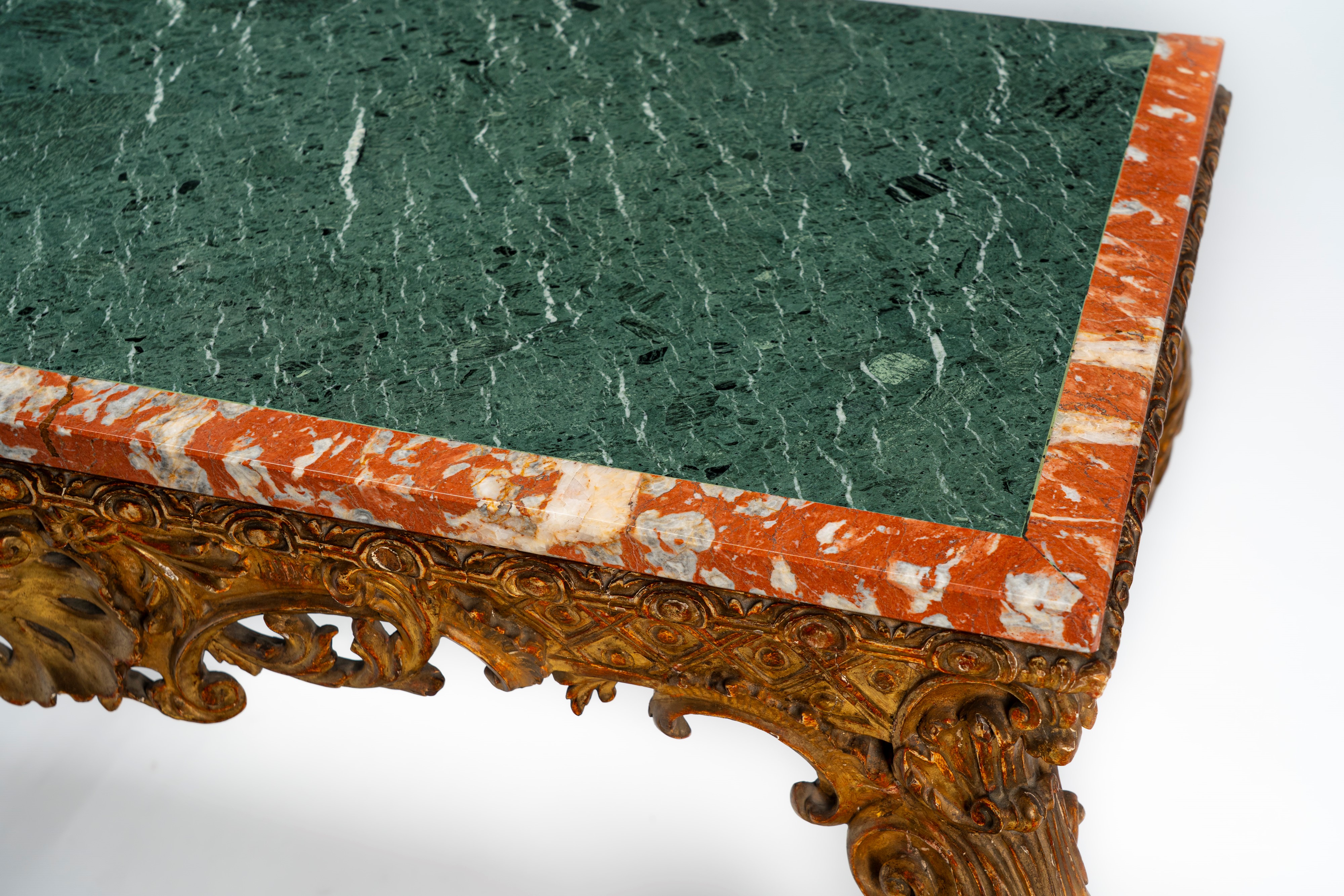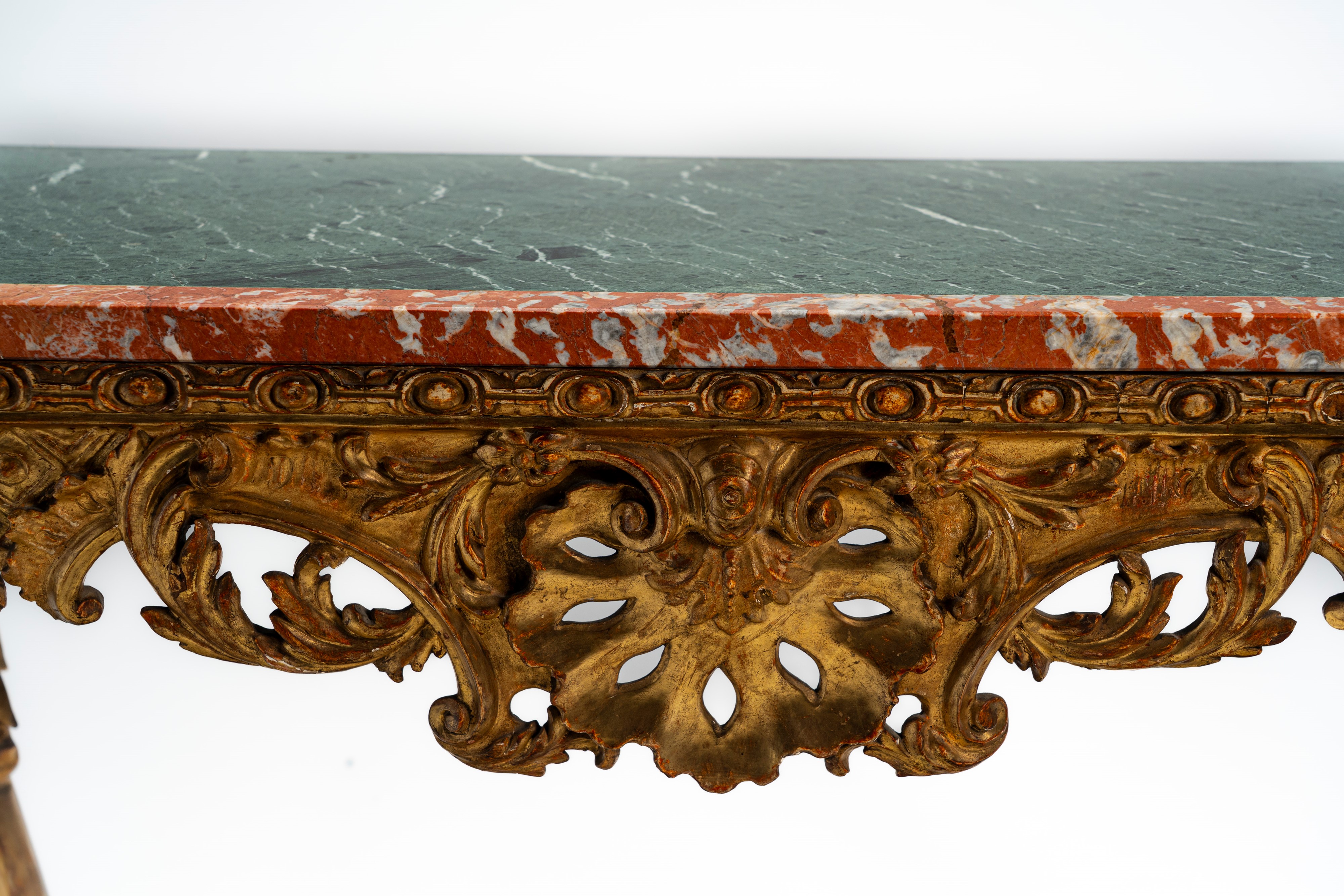 Console in legno intagliato con gambe mosse ornate da motivi fogliacei, volute e piedi ferini, fregio traforato centrato da motivo a conchiglia. Piano in marmo. Secolo XIX