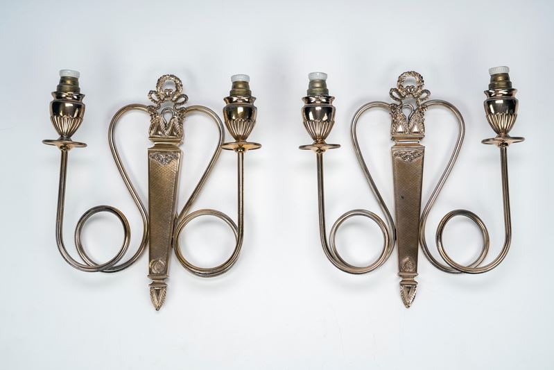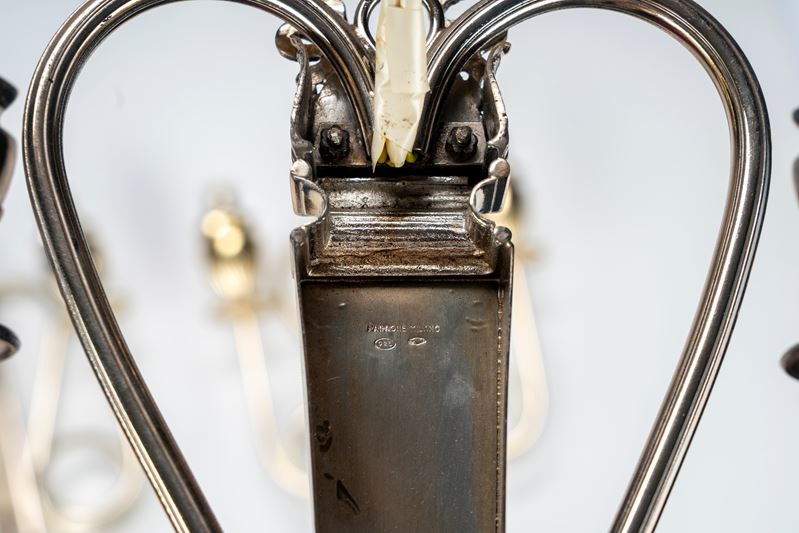 sostegno a lesena rastremata sormontata da corolla di alloro con bracci mossi. Punzone "Faraone Milano", 925.