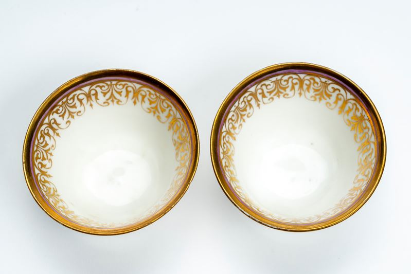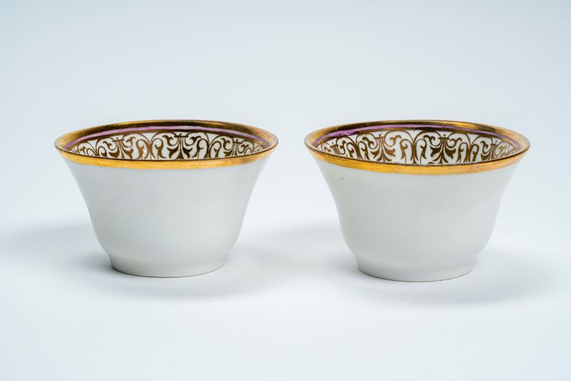 Due tazze in porcellana con decoro policromo a fiori. Una di manifattura Nyon, 1780–1790, l’altra...