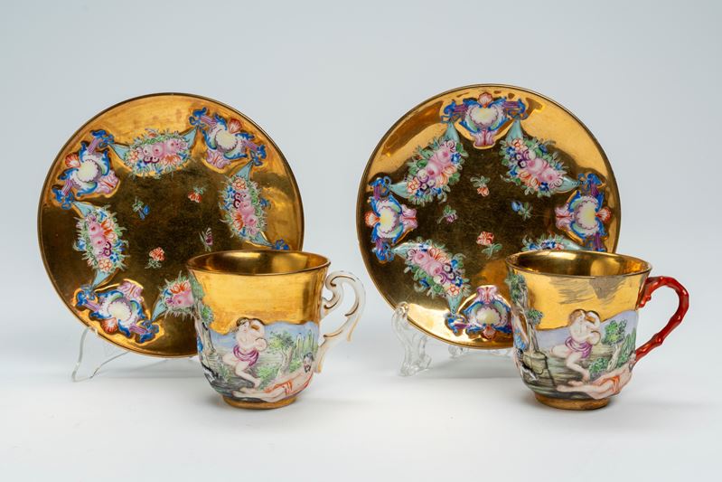Coppia di tazzine con piattino in porcellana a fondo dorato e a rilievo. Manifattura Ginori, seconda metà secolo XIX