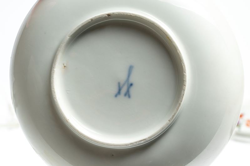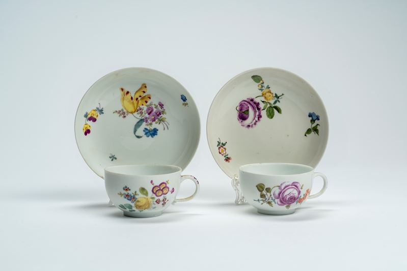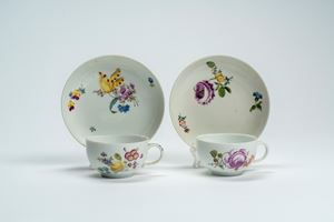 Coppia di tazzine con piattino in porcellana policroma “al mazzetto” e a fiori sparsi. Manifattura di Meissen, 1770 circa