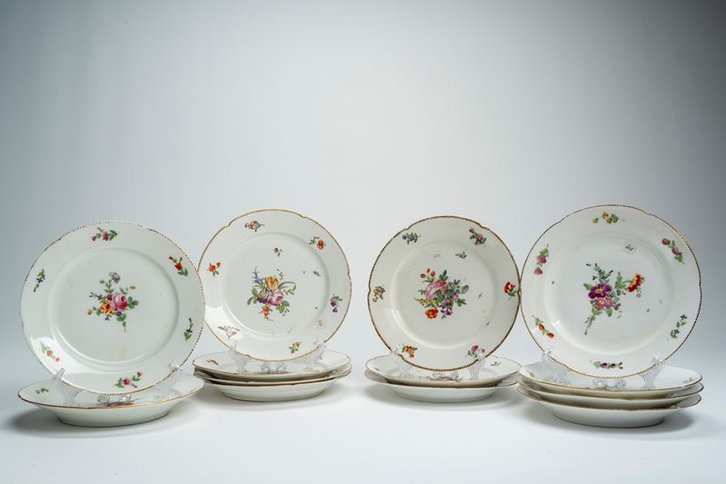 Dodici piatti piani in porcellana a bordo mosso e dorato decorati in policromia a mazzetto e fiori sparsi. Francia, fine secolo XVIII