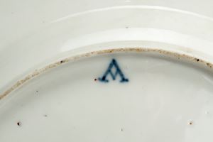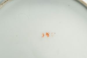 Cavetto centrato da bouquet di fiori, falda con rametti di fiori sparsi. Tre piatti con marca di fabbrica in blu (probabilmente manifattura Rue Amelot ?), quattro piatti con marca di fabbrica in rosso ferro “CP” coronato (Parigi, Faubourg Saint-Denis). Altri due piatti con marca in rosso ferro non identificabile. Lievi difetti.