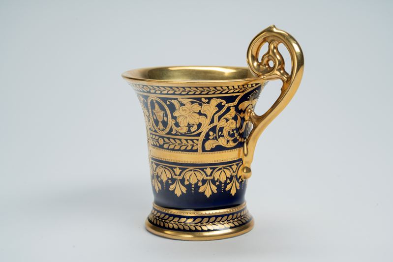 La prima tazza a fondo blu con ricche dorature a rilievo, ornata da un medaglione con ritratto di donna, la seconda decorata con un bouquet di fiori avvolto da un nastro bianco e rosa con iscrizione “In ricordo del vostro amore”. Entrambe con ansa a ricciolo. Marca di fabbrica.