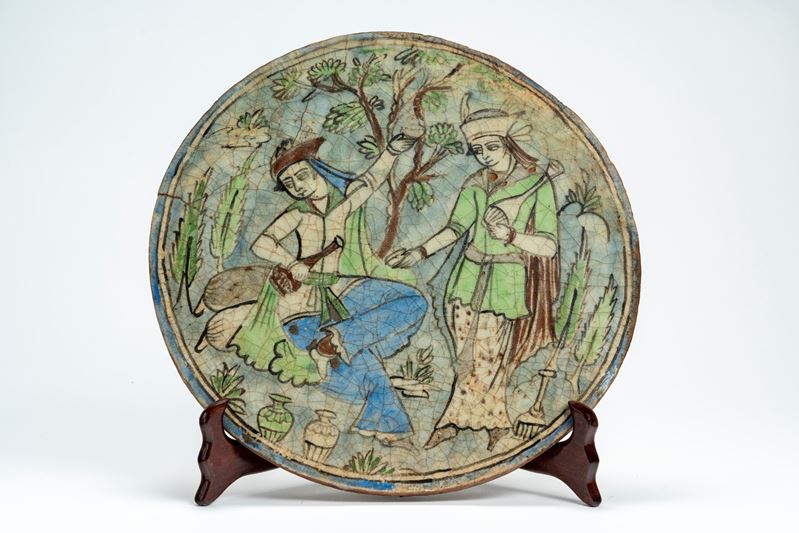 Grande placca in terraglia smaltata con scena conviviale qajar in un giardino. Persia, fine secolo XIX/XX