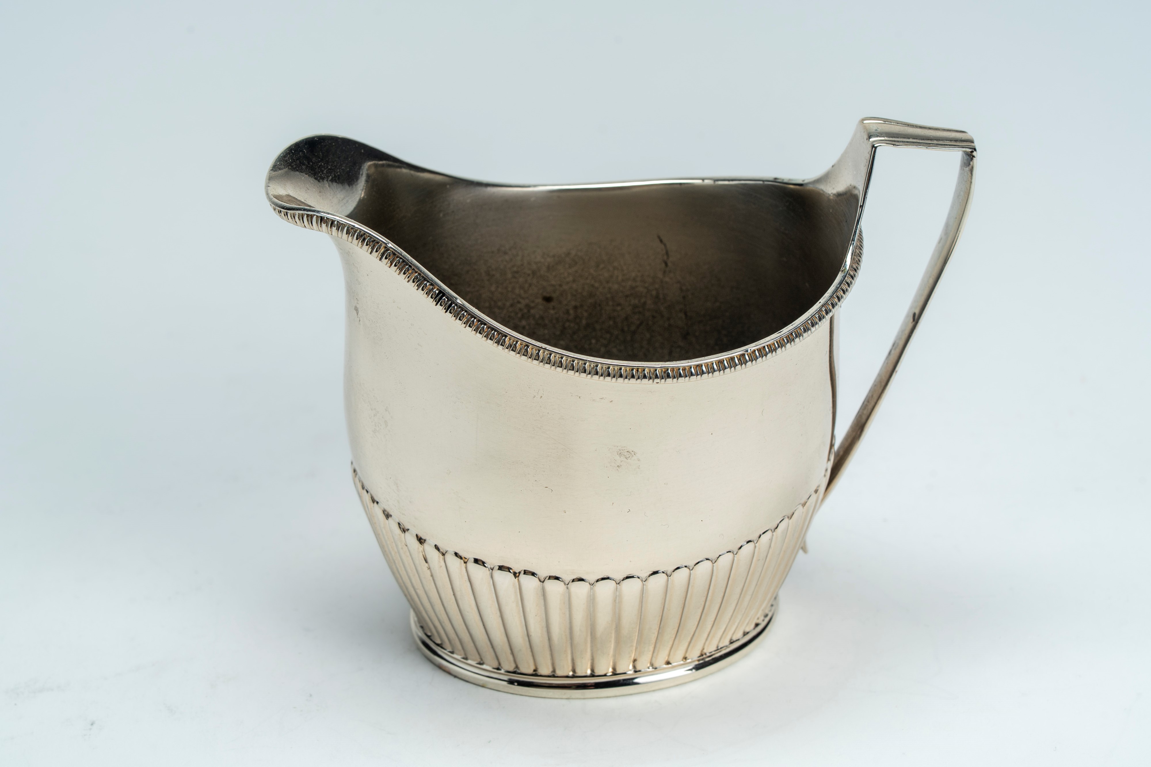 Lattiera in argento 925 a corpo liscio e costolato con ansa sagomata. Londra, 1800