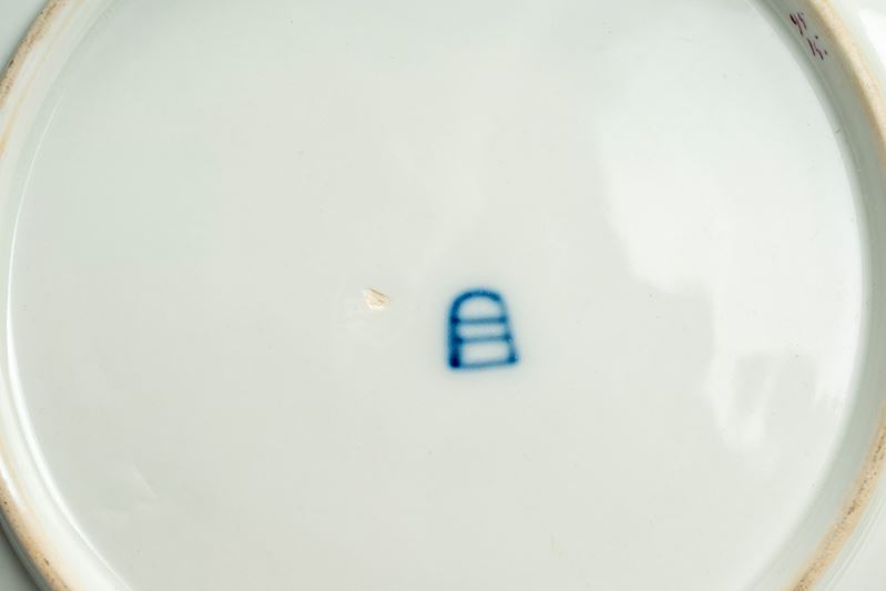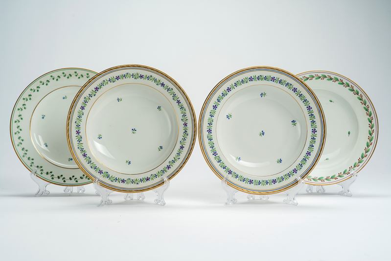 Lotto composto da una coppia di piatti fondi in porcellana decorati in policromia a fiordalisi sparsi e profilati in oro e da altri due piatti fondi con decoro a ghirlande di foglie e fiorellini sparsi con profili dorati. Vienna, fine secolo XVIII-inizio secolo XIX