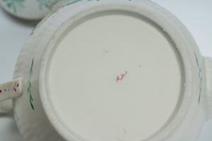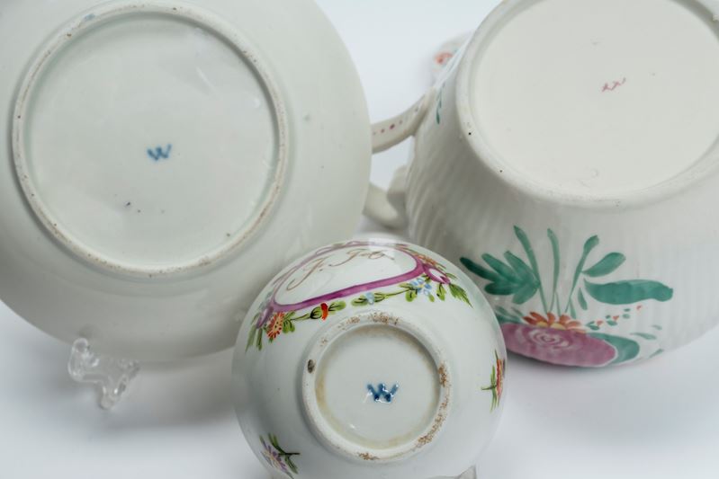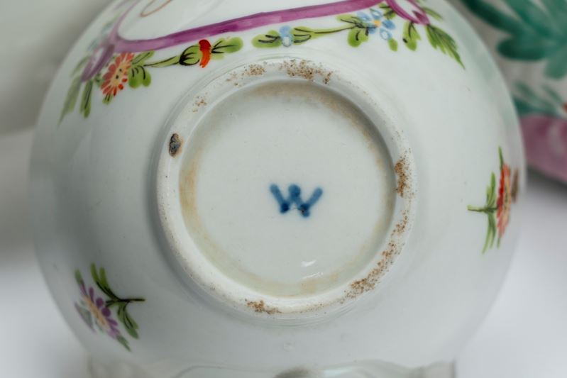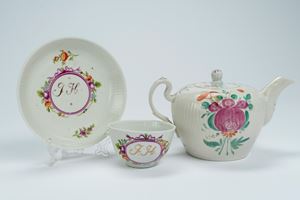 Lotto composto da una tazzina con piattino in porcellana decorata in policromia con monogramma in un cartiglio color porpora ed una teiera con decoro policromo a fiori. Germania, Wallendorf, 1770-1790 circa