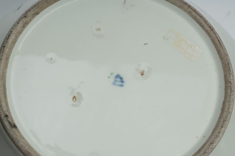 Vassoio biansato in porcellana decorata in policromia e a rilievo con motivi floreali e insetti....