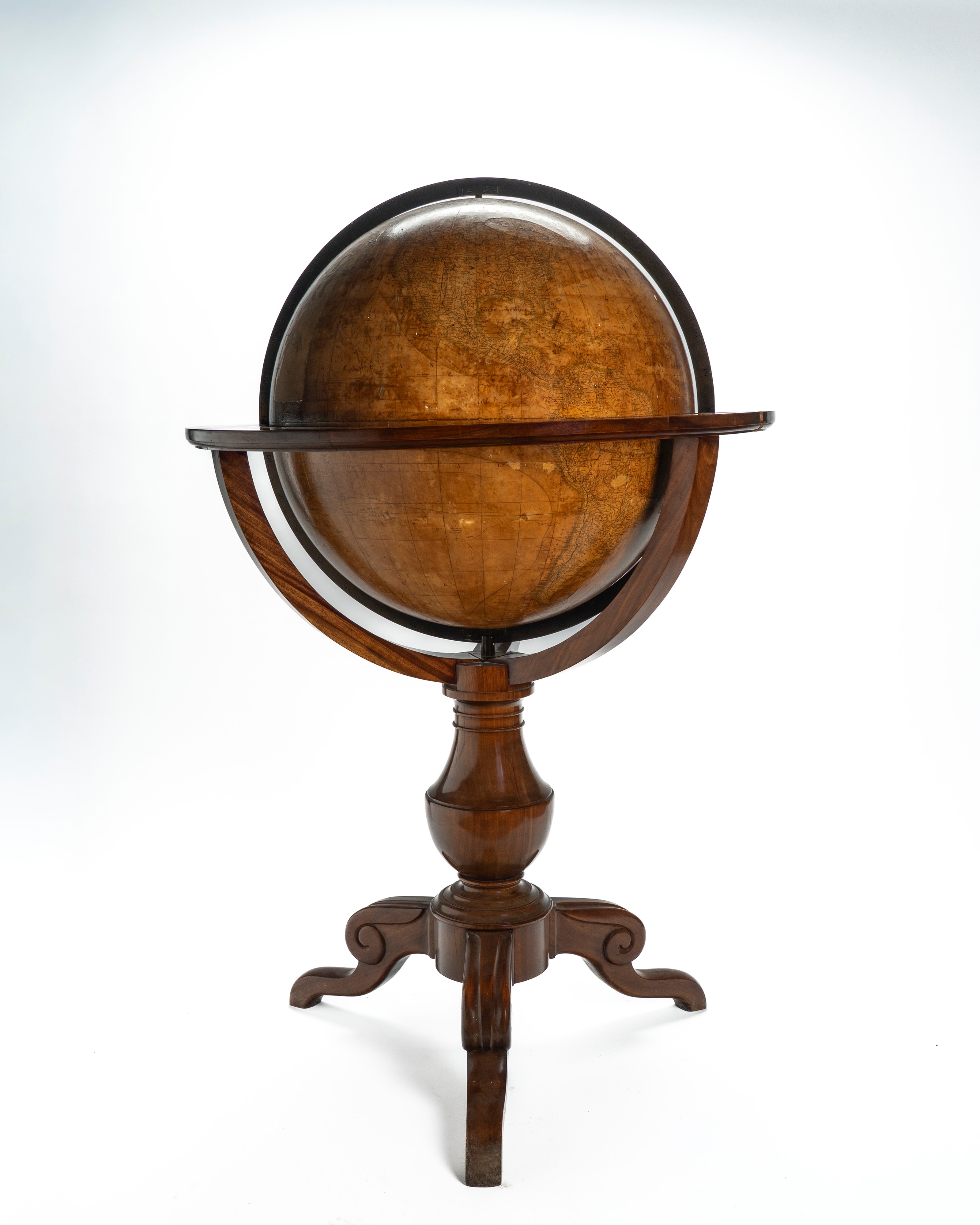 Maison Delamarche, Parigi, 1880. Imponente globo terrestre da terra con sostegno tripode in legno tornito di epoca successiva