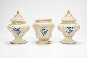 Stagnara con versatoio "a bocca di lepre" in maiolica con decoro blu cobalto a stemma. Savona,...