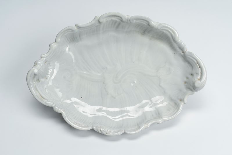 Marescialla in porcellana bianca a rilievo, in forma di valva di conchiglia, con profilo mistilineo a volute. Manifattura Ginori a Doccia, circa 1770