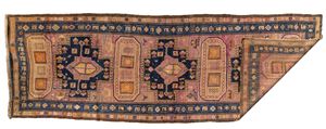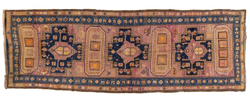 fondo rosa con tre gradi medaglioni blu con elementi geometrici interni in giallo e arancio, bordura blu scuro a motivi geometrici stilizzati.