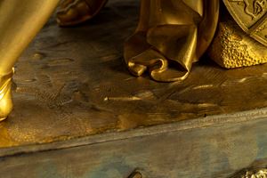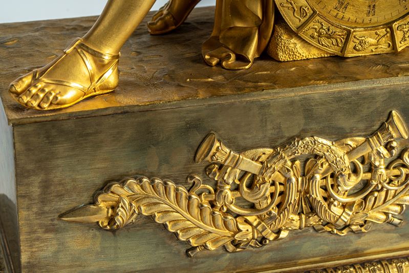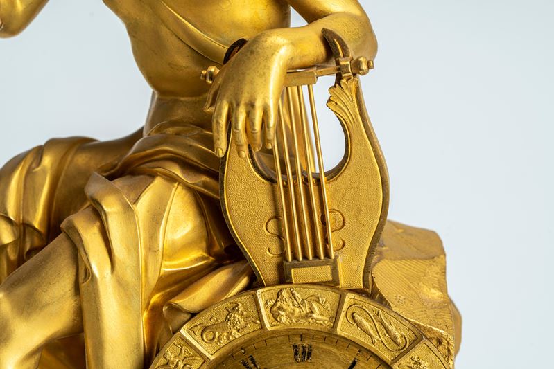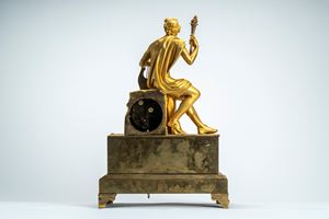 base a plinto con fregio di gusto neoclassico a bassorilievo con piedini anteriori ferini. Apollo seduto su una roccia contenente il quadrante dorato a numeri romani con lancette del tipo "Breguet" e fascia con segni zodiacali. Meccanismo firmato "Pons", attribuibile a Pierre-César Honoré Pons, a carica settimanale, dotato di sistema di blocco e riattivazione automatica della suoneria nelle ore notturne.