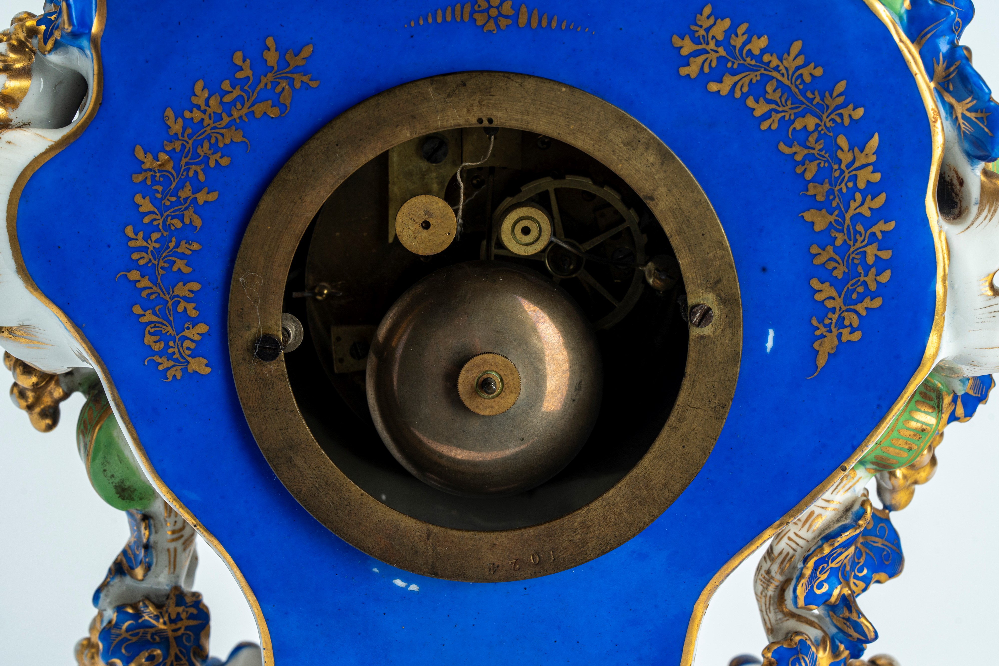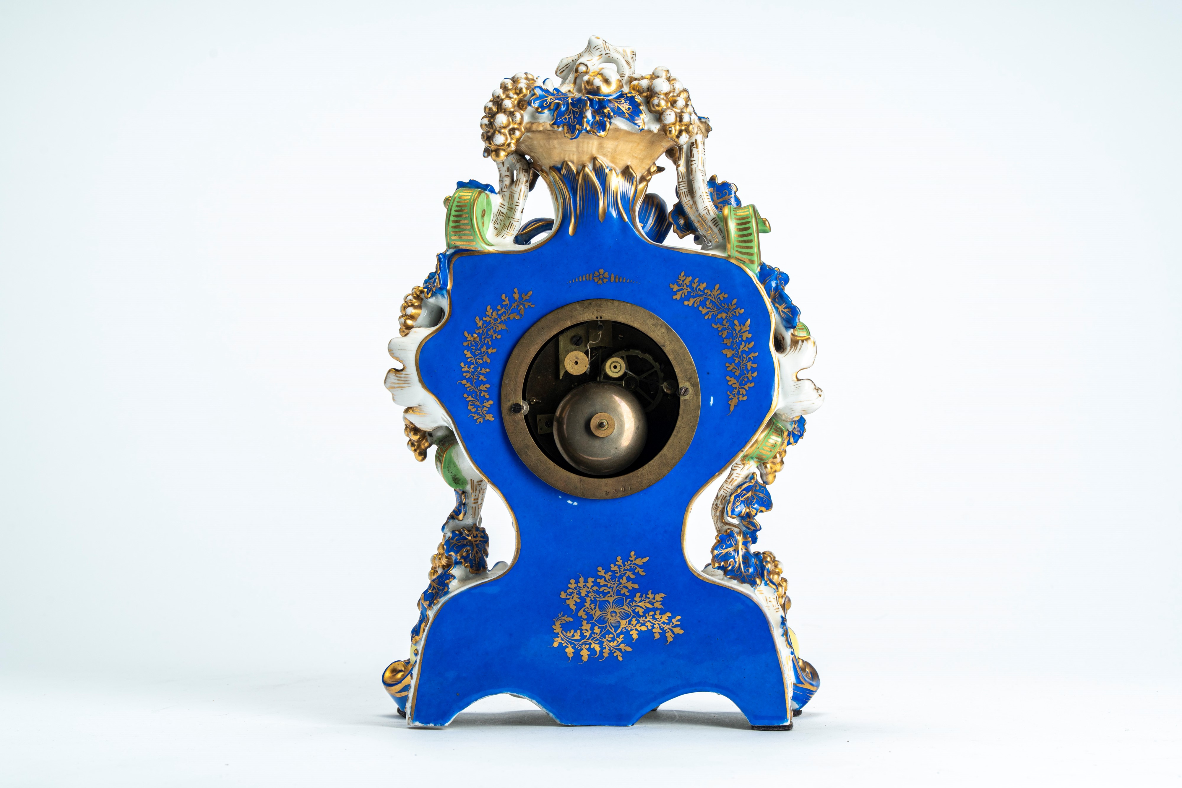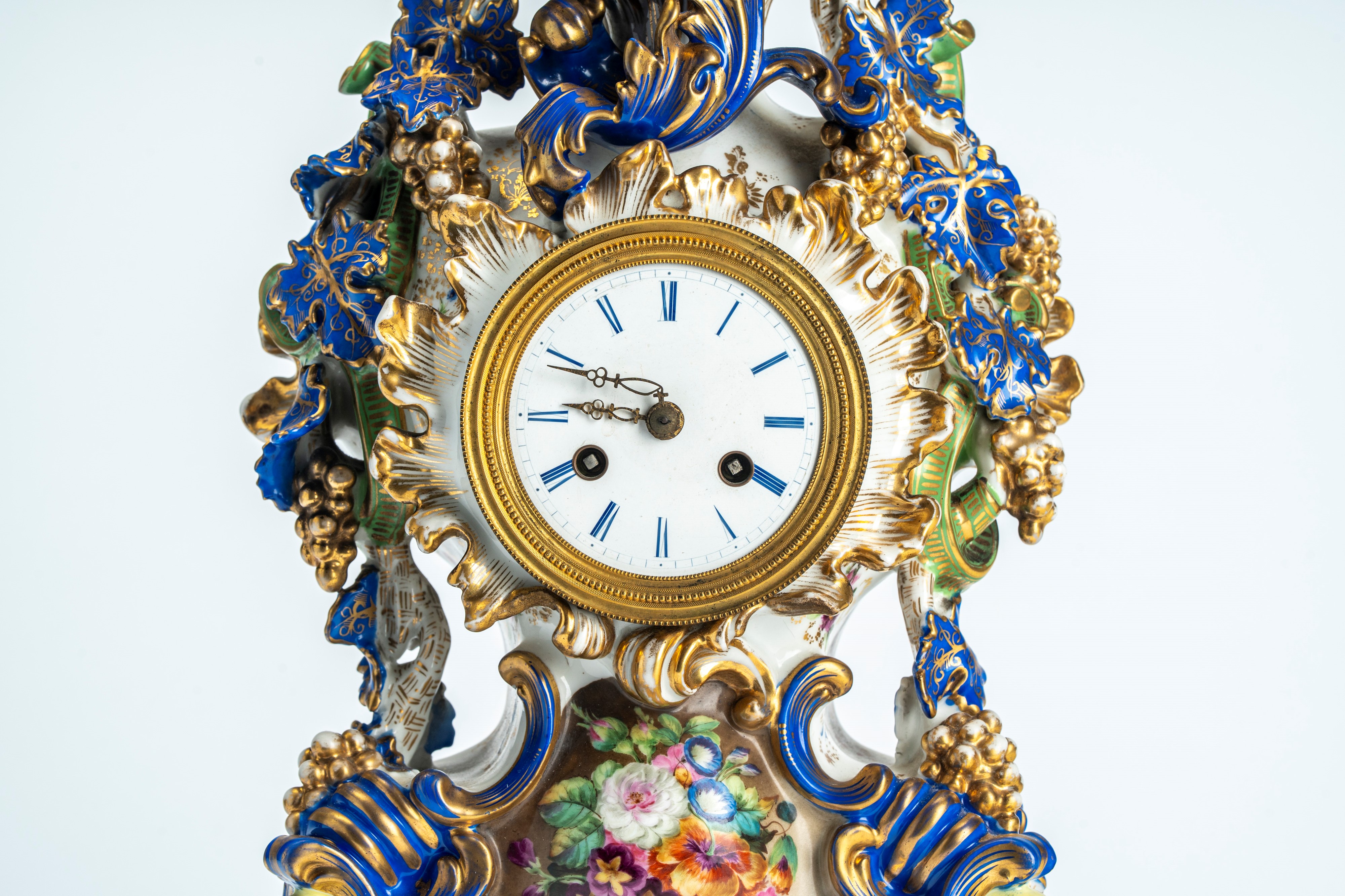 Pendola di forma mossa in porcellana policroma e dorata riccamente decorata a tralci di vite, poggiante su base con riserva ovale centrale dipinta a bouquet floreale. Quadrante circolare in smalto bianco a numeri romani. Jacob Petit, Francia, seconda metà secolo XIX
