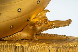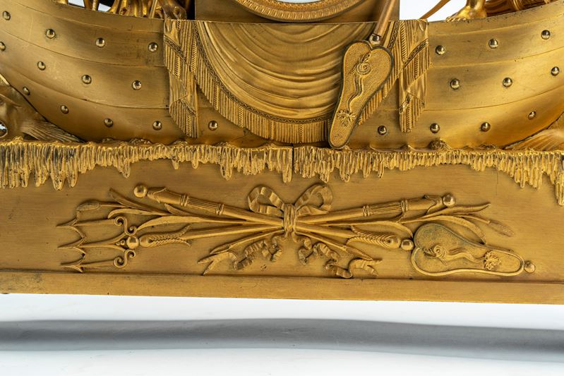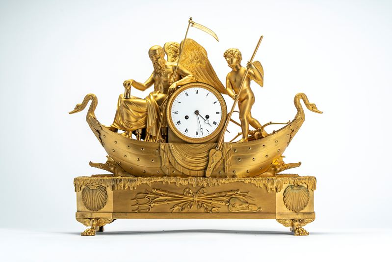 raffigurante Saturno e Cupido a bordo di un vascello con teste di cigno alle estremità e due teste di drago sotto allo scafo. Cupido governa la barca con un remo mentre Saturno è appoggiato a una cassa all’interno della quale è inserito il quadrante in smalto bianco a numeri romani. La nave poggia su un basamento ottagonale simulante le onde del mare e ornato sui lati corti da conchiglie e sul lato lungo da un fascio di gusto neoclassico in bassorilievo con pala e tridente. Il basamento poggia su quattro zampe ferine.