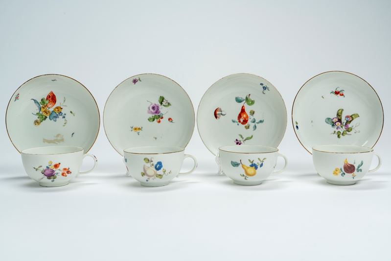 Quattro tazzine con piattino in porcellana con decoro policromo a frutti e fiori. Manifattura di Meissen, 1770 circa