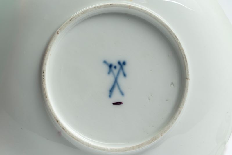 Quattro tazzine con piattino in porcellana decorata in policromia a fiori. Manifattura di Meissen,...