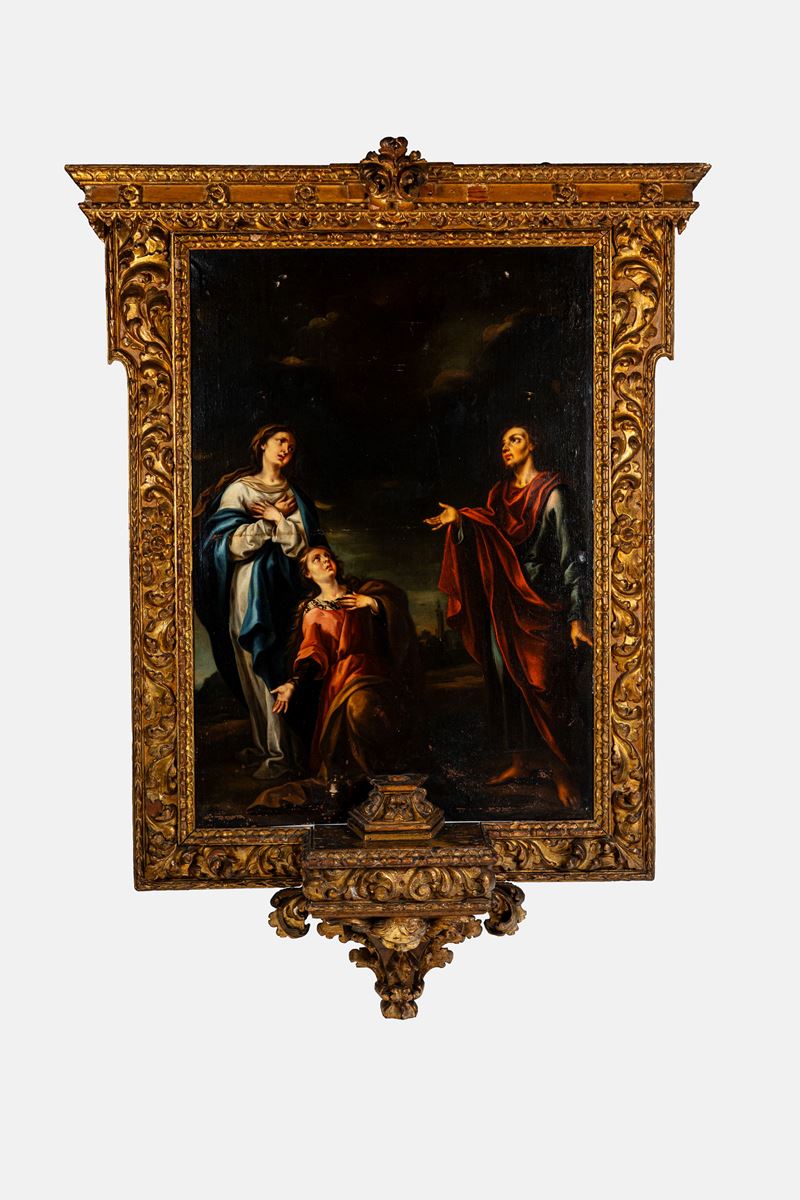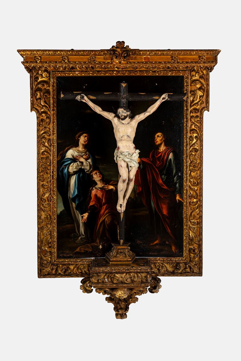Olio su tela entro importante cornice a tabernacolo in legno intagliato e dorato a volute fogliate, con Cristo crocifisso realisticamente reso in legno intagliato e laccato poggiante su base sorretta da figura di putto.