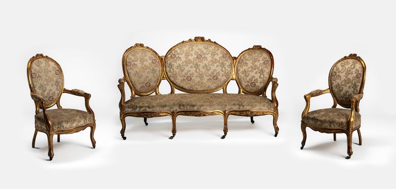 Salotto composto da divano tre posti e due poltrone in legno intagliato e dorato ricoperto in tessuto operato, secolo XIX-XX