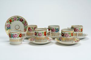 Sei tazzine con piattini in porcellana, decorate in policromia a motivi floreali con dorature. Francia, inizio secolo XIX