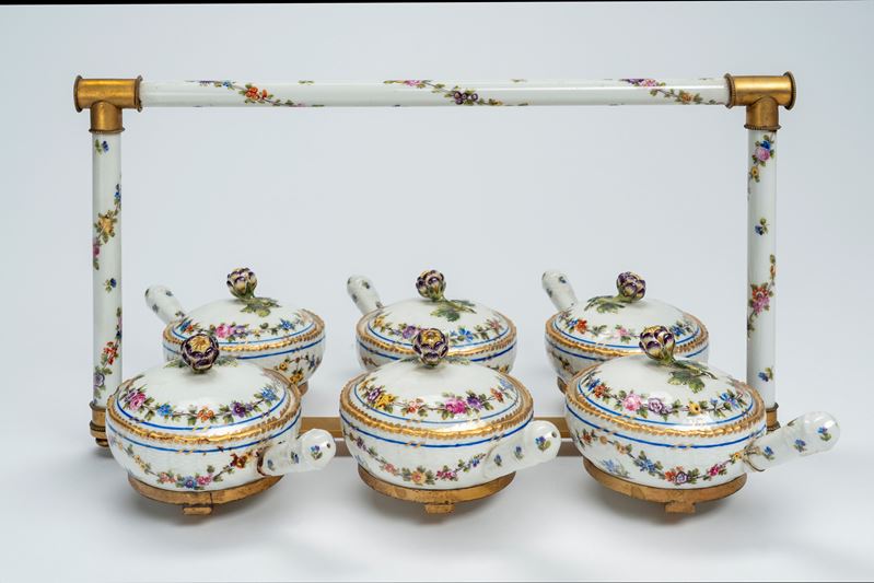 Servizio da tavola per salse e confetture in porcellana bianca parzialmente a rilievo, con decoro policromo a ghirlande di fiori e profili dorati. Germania, 1780 circa.