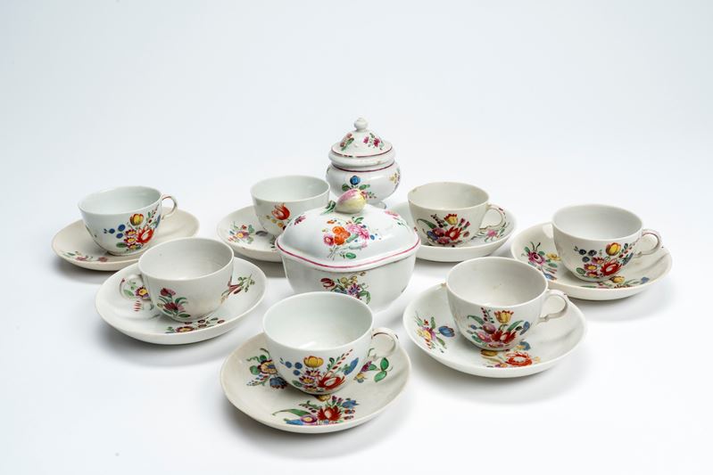 Sette tazzine con piattino, una zuccheriera con coperchio e una cremiera in porcellana con decoro policromo “al mazzetto”. Manifattura Ginori a Doccia, circa 1770