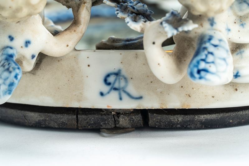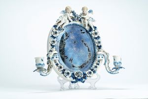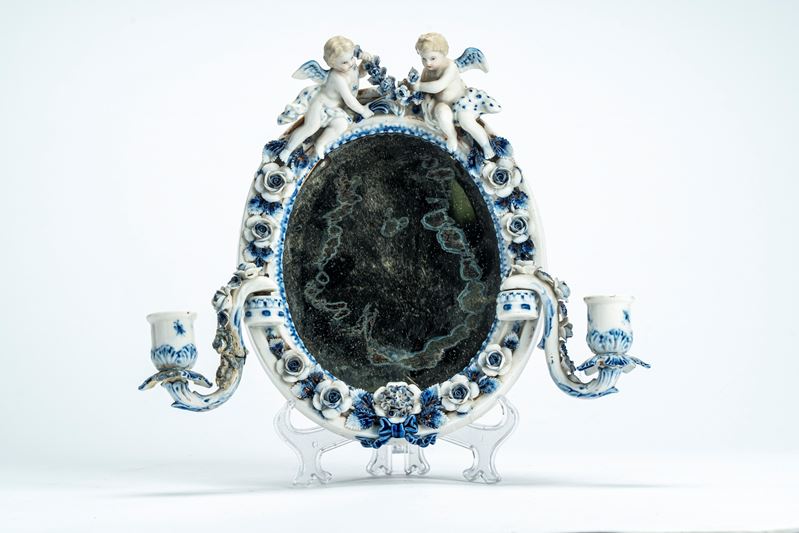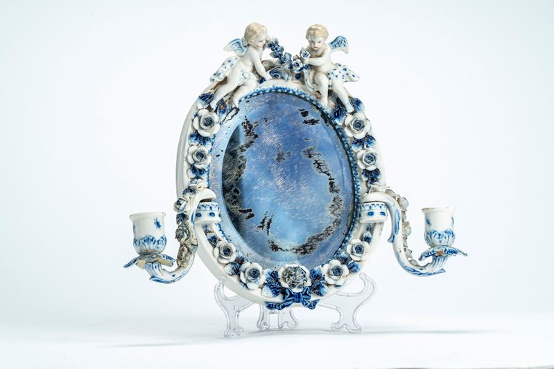 Specchierina di forma ovale in porcellana decorata a fiori, foglie, fiocco a rilievo e sormontata da due putti alati con festone, con due bracci porta candela removibili a voluta. Manifattura tedesca, secolo XIX