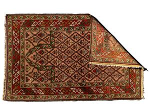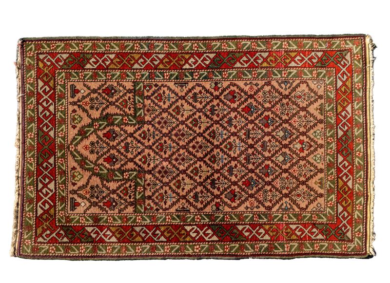 Fondo avorio a piccoli rombi e elementi floreali stilizzati con mihrab verde oliva in alto, bordure a motivi geometrici policromi.