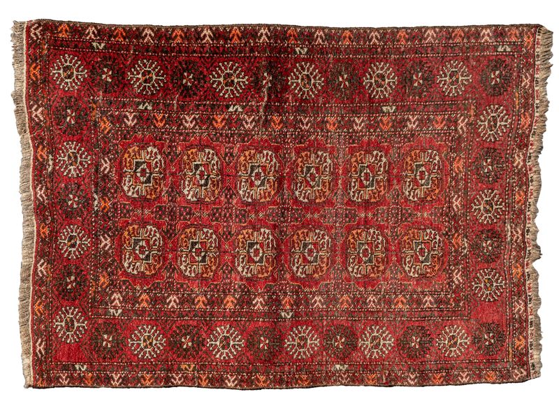 fondo rosso a gul ottagonali con rosette secondarie, bordure geometriche multiple.