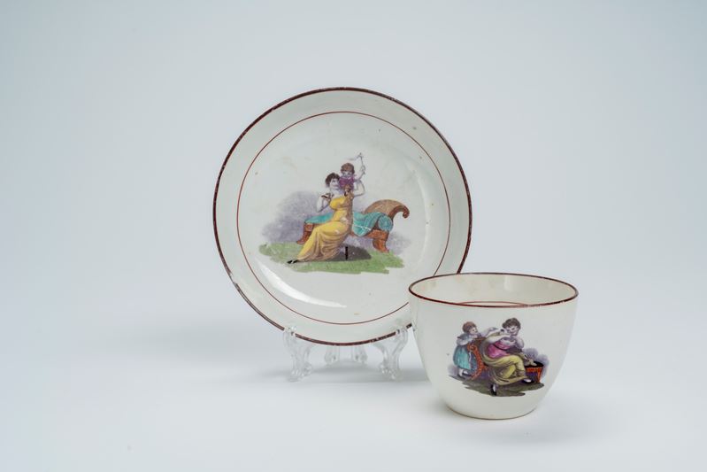 Profili in bruno, scena con madre e figlio che giocano seduti su una chaise longue in un paesaggio, ansa della tazza ad anello.