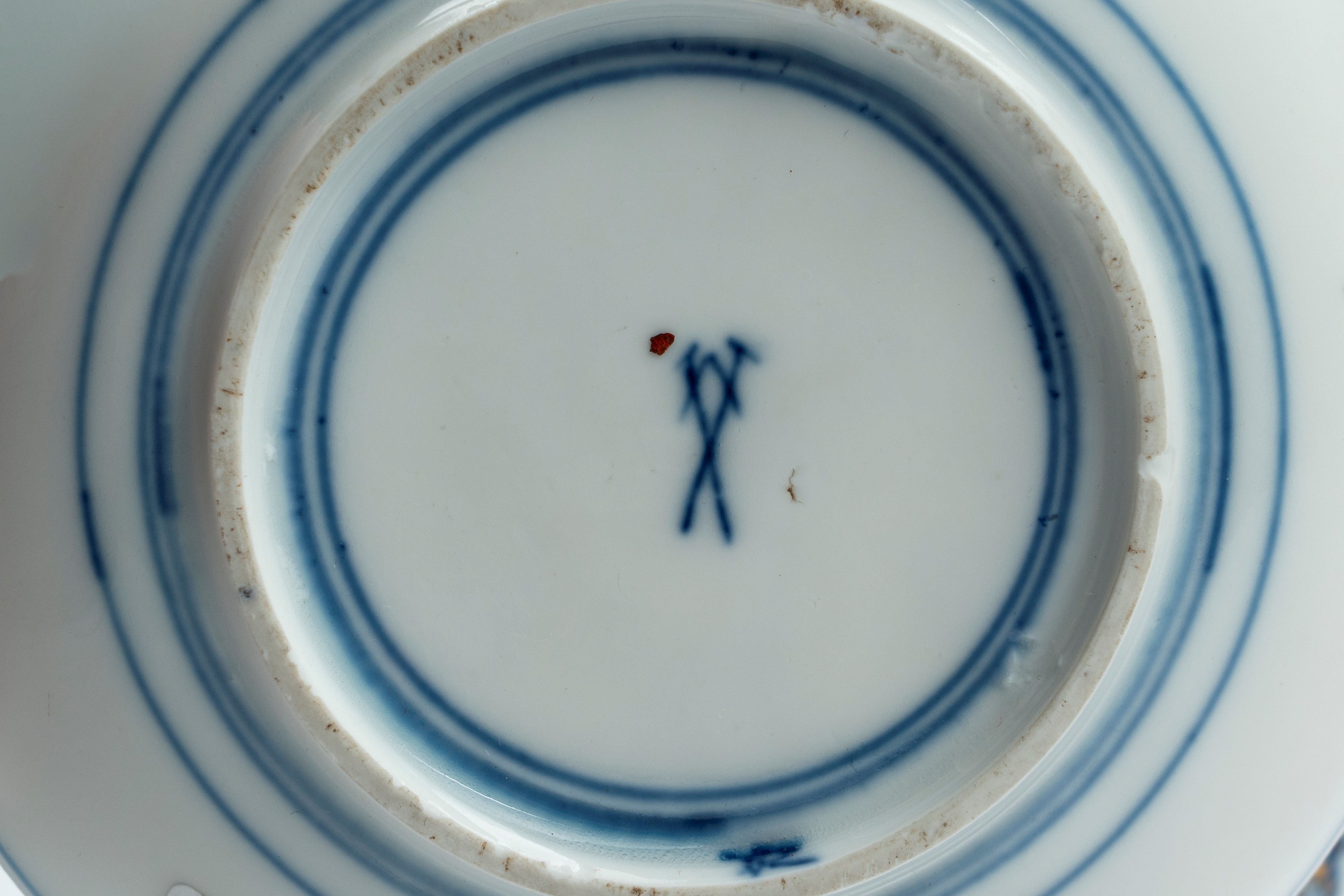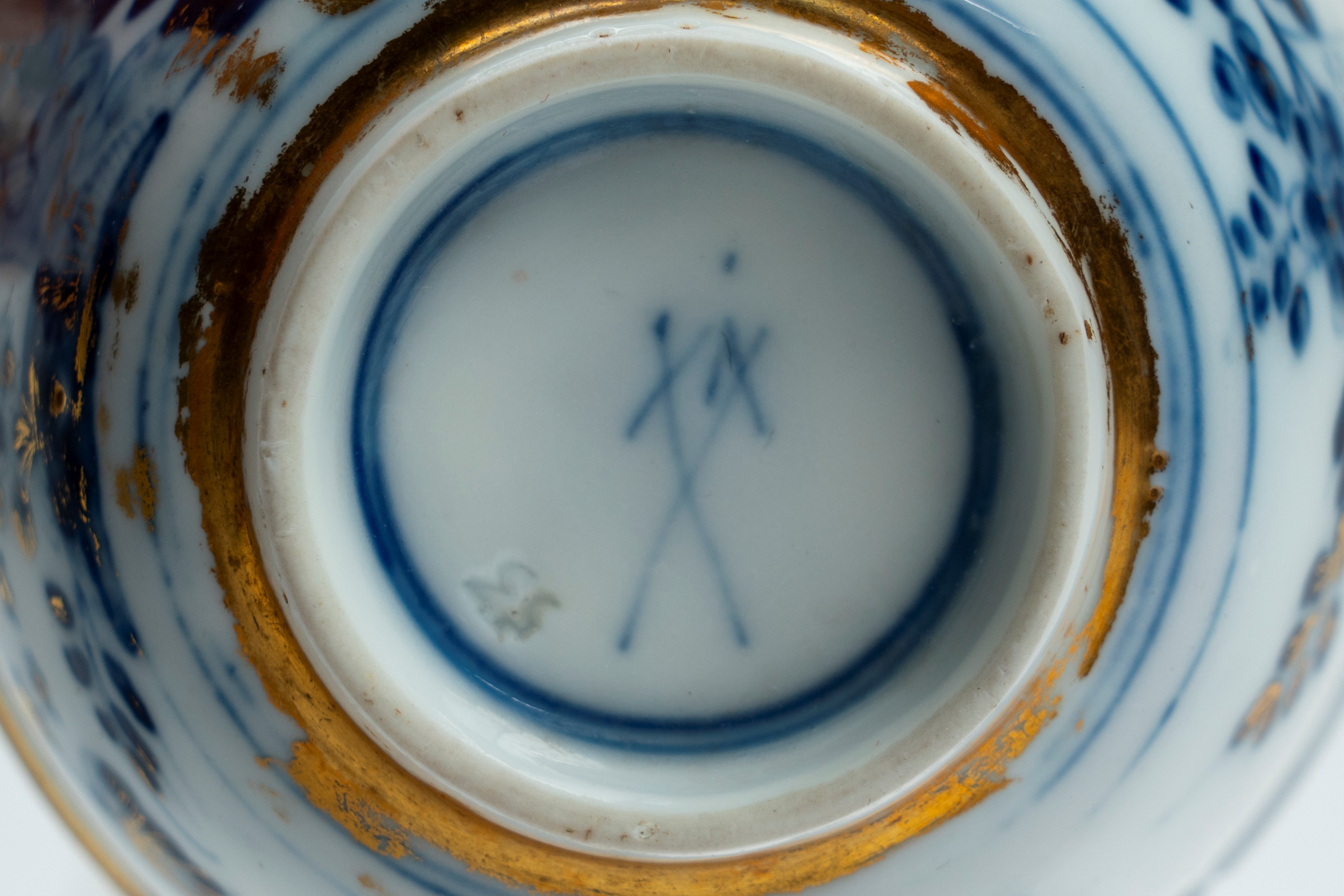 Tazzina con piattino in porcellana, con decoro monocromo in blu cobalto all’orientale e in oro. Manifattura di Meissen, prima metà secolo XVIII