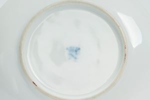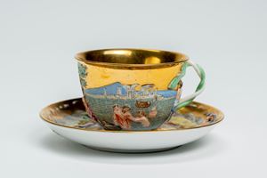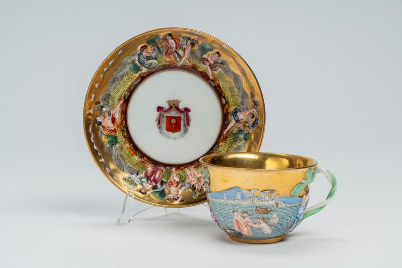 La tazza e la falda del piattino decorate con scene classiche, ansa a cordoli intrecciati terminanti a foglie, il cavetto con stemma della famiglia Rossi.