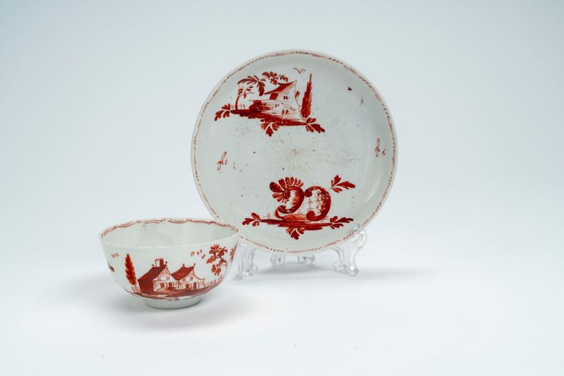 Tazzina con piatto in porcellana con decoro monocromo in rosso ferro a paesaggi. Manifattura Antonibon, Nove di Bassano, 1770 circa