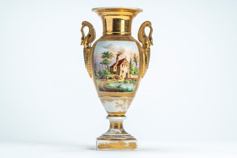 Vaso ovoidale in porcellana a fondo dorato con scene policrome agresti, anse a sfingi alate, su base quadrata dipinta a finto marmo. Francia, prima metà secolo XIX