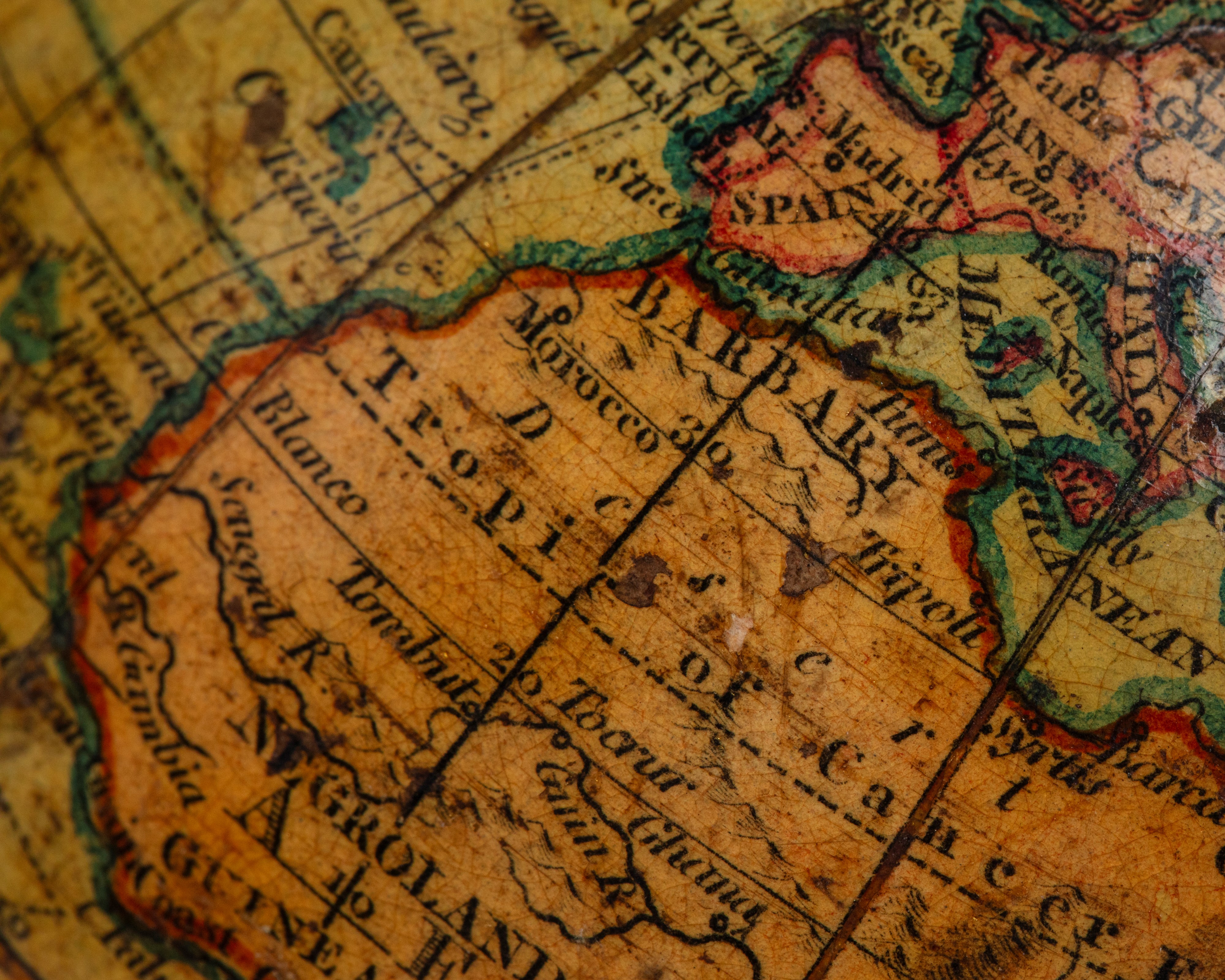 Astuccio di forma sferica rivestito in finto zigrino, con chiusura in metallo, l'interno è foderato con gore incise, un lato raffigurante “The WORLD as known in Caesar's Time agreeble to D'Anville” e l'altro emisfero è foderato con “A TABLE OF Latitudes & Longitudes of Places not given on this GLOBE”.