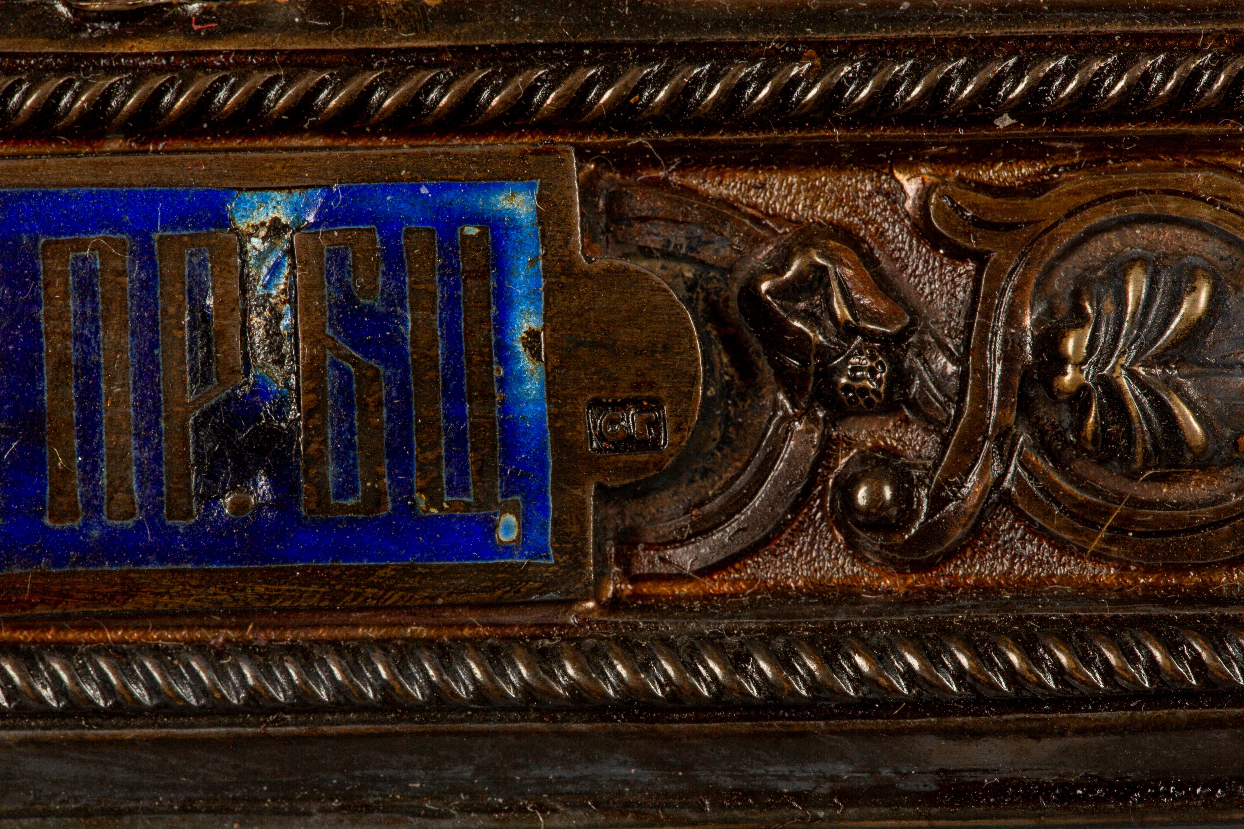 Bordo sbalzato a volute e motivi floreali, vesti a filigrana traforata, aureole con smalti policromi